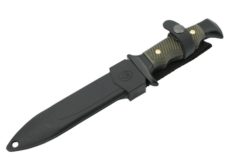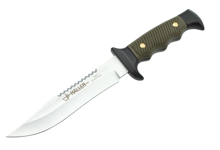 Knife with recessed handle, 420 steel blade. Single-edged blade with saw back. Plastic sheath with safety. From the Spanish knifemaker Muela.