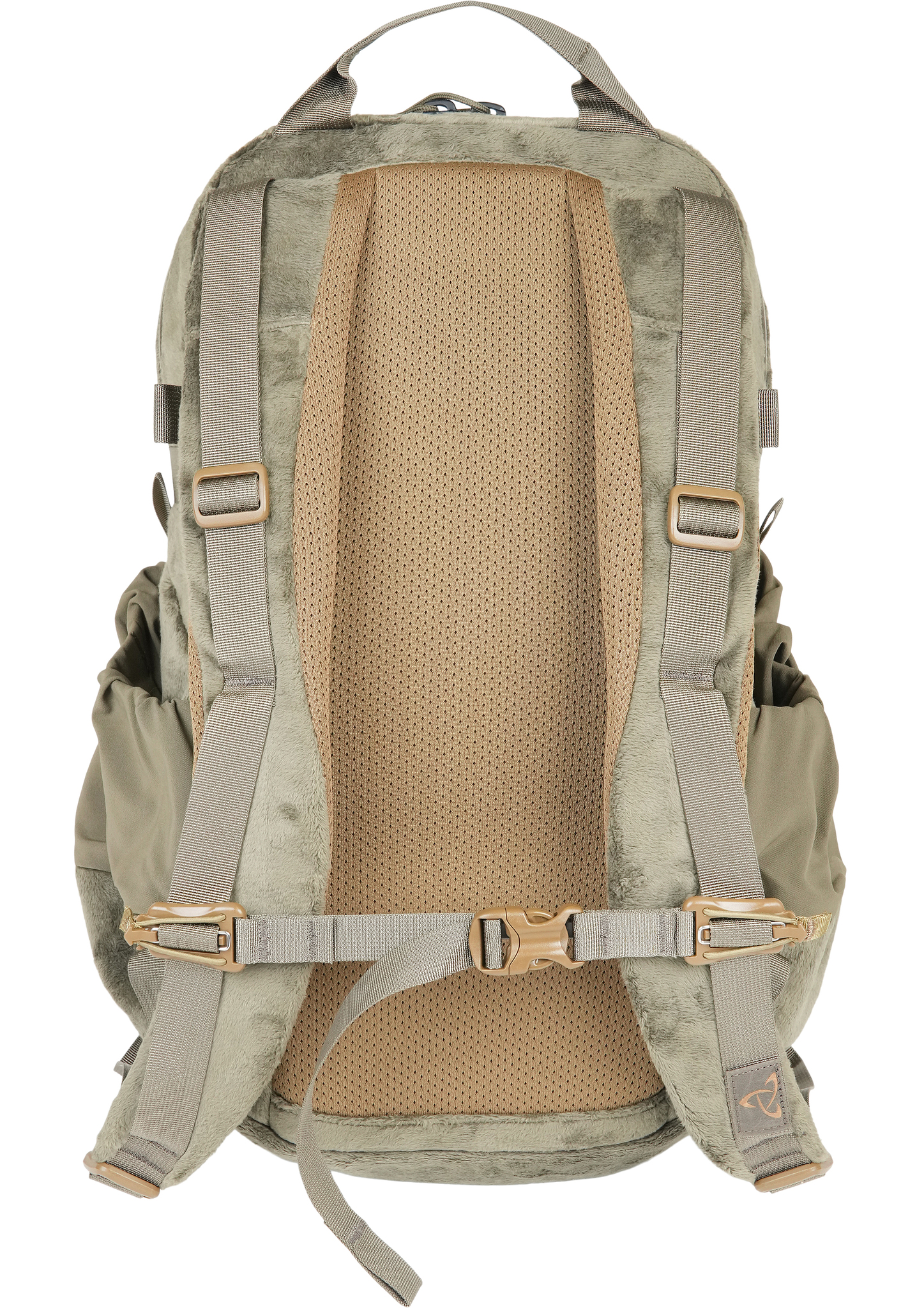 The TREEHOUSE 16 backpack is the perfect pack for short hunting trips where you need to carry your gear into the woods. Designed specifically for tree hunters, this pack has a fluffy polyester laminate with nylon 210 fabric on the back that is noise dampening, water repellent and provides easy access to the interior without giving away your location. Extremely durable, water-repellent and quiet in the wilderness, the unique, tailored fuzzy polyester with 210D nylon laminate on the back draws attention away from you. The spacious interior offers room for extra clothes and other essentials for the hide. The top opening access with two zippers facilitates access to the interior and is complemented by multiple compartments and pockets for organization and individual attachment of accessories. The adjustable tree strap allows the rucksack to be quickly attached to the tree in the optimum position. The compression straps on the front allow a bow, lightweight tree stand or climbing poles to be attached securely. The side pockets and compression straps provide a secure hold for quivers or camera equipment.