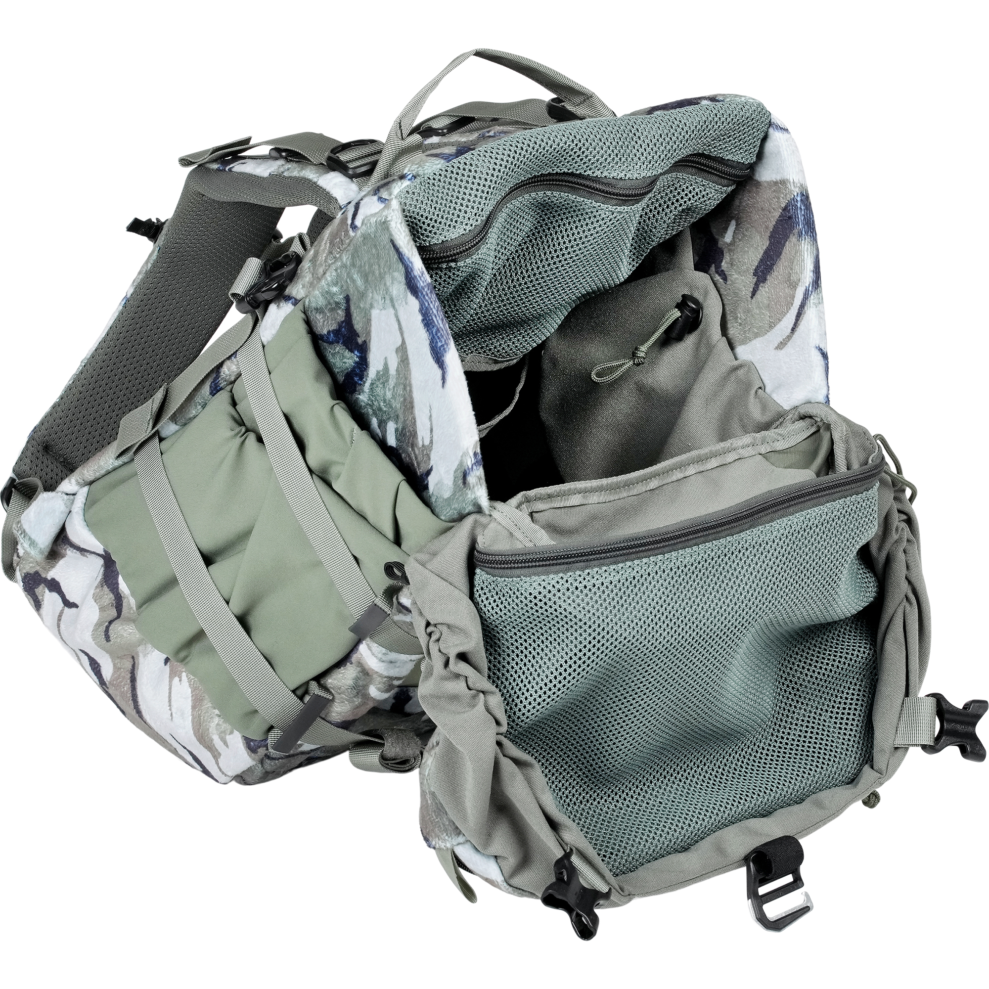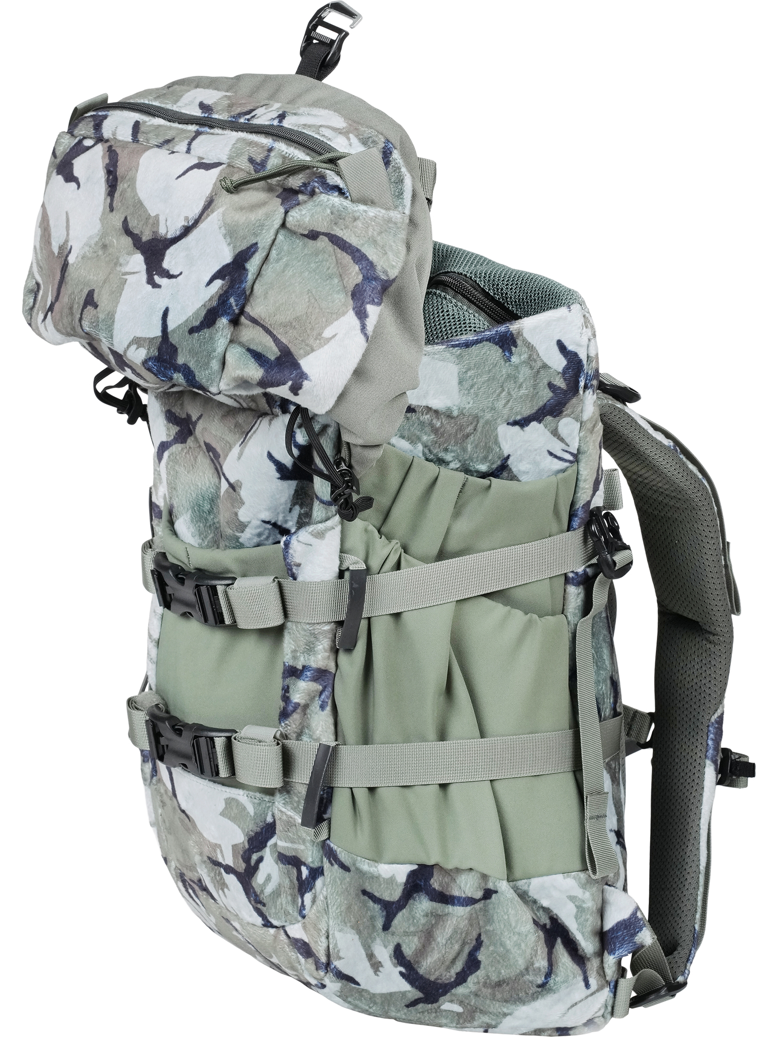 The TREEHOUSE 20 Backpack is the perfect backpack for short hunting trips where you need to carry your gear into the woods. Designed specifically for tree hunters, this backpack has a fluffy polyester laminate with nylon 210 fabric on the back that muffles noise, repels water and provides easy access to the interior without giving away your location. Extremely durable, water resistant and quiet in the wilderness, the unique custom fuzzy polyester with 210D nylon laminate on the back deflects attention away from you. The roomy interior provides space for extra clothes and other sit-down essentials. The top-opening, dual-zipper access makes it easy to get inside, and is complemented by multiple compartments and pockets for organization and custom attachment of accessories. The adjustable tree strap allows the pack to be quickly secured in the optimal position on the tree. The front compression straps allow you to securely attach a bow, lightweight tree stand or climbing poles. The side pockets and compression straps provide secure storage for quivers or camera gear.