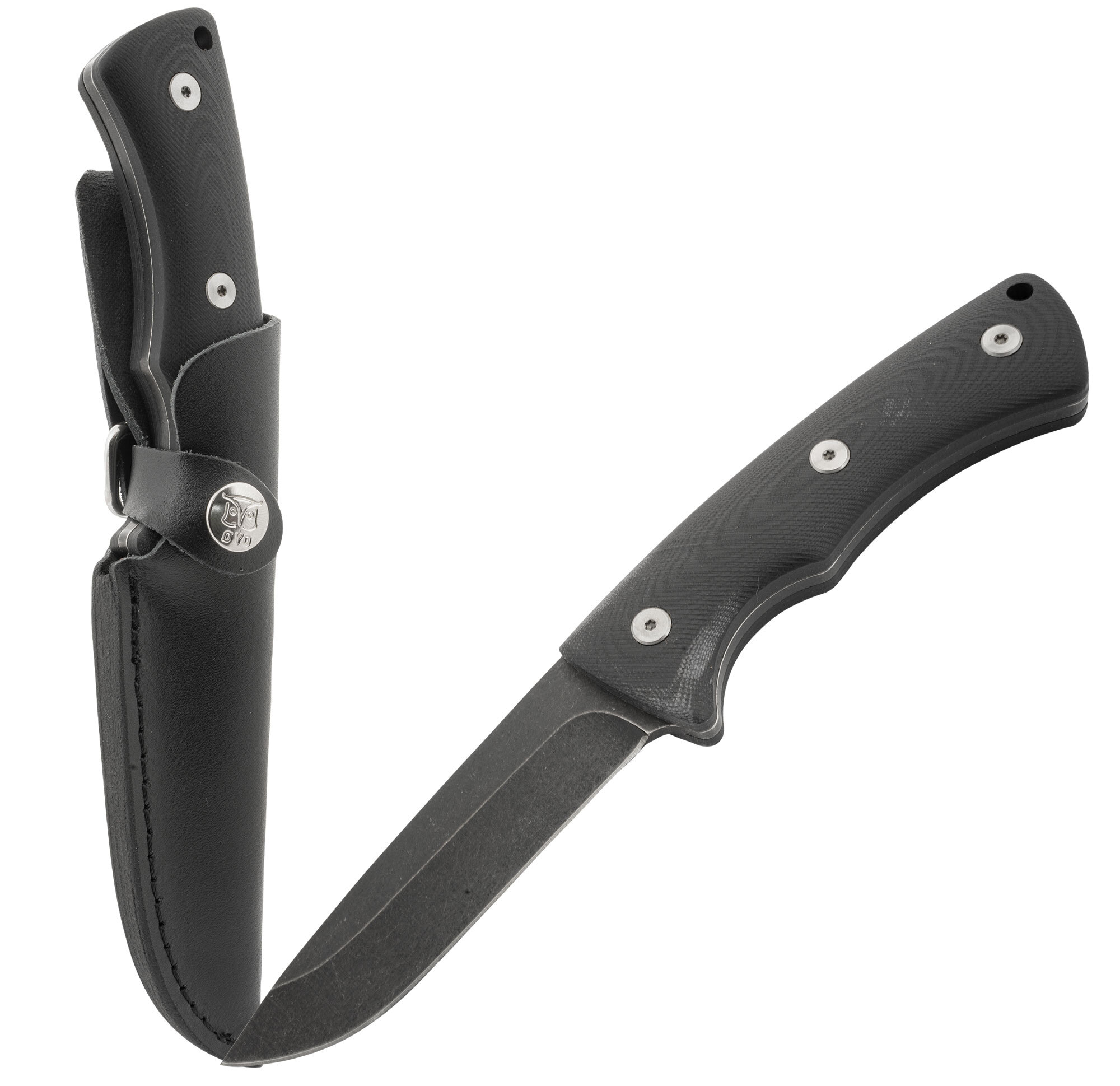 The Oyo Falketind is a strong, versatile bushcraft and survival knife made of oxidized exclusive steel that withstands rough use. It stays sharp for a long time and is easy to sharpen. With its shape and choice of materials, theFalketind Slirekniv is one of the classic Norwegian bushcraft and survival knives. A black Micarta handle is used, which is safe and comfortable in the hand at all times. At the end of the handle of the knife is a catch strap eyelet incorporated, through which the a leather strap can be pulled. The knife is completed with a strong leather sheath. The no-frills design allows for easy cleaning of the knife after work is done.