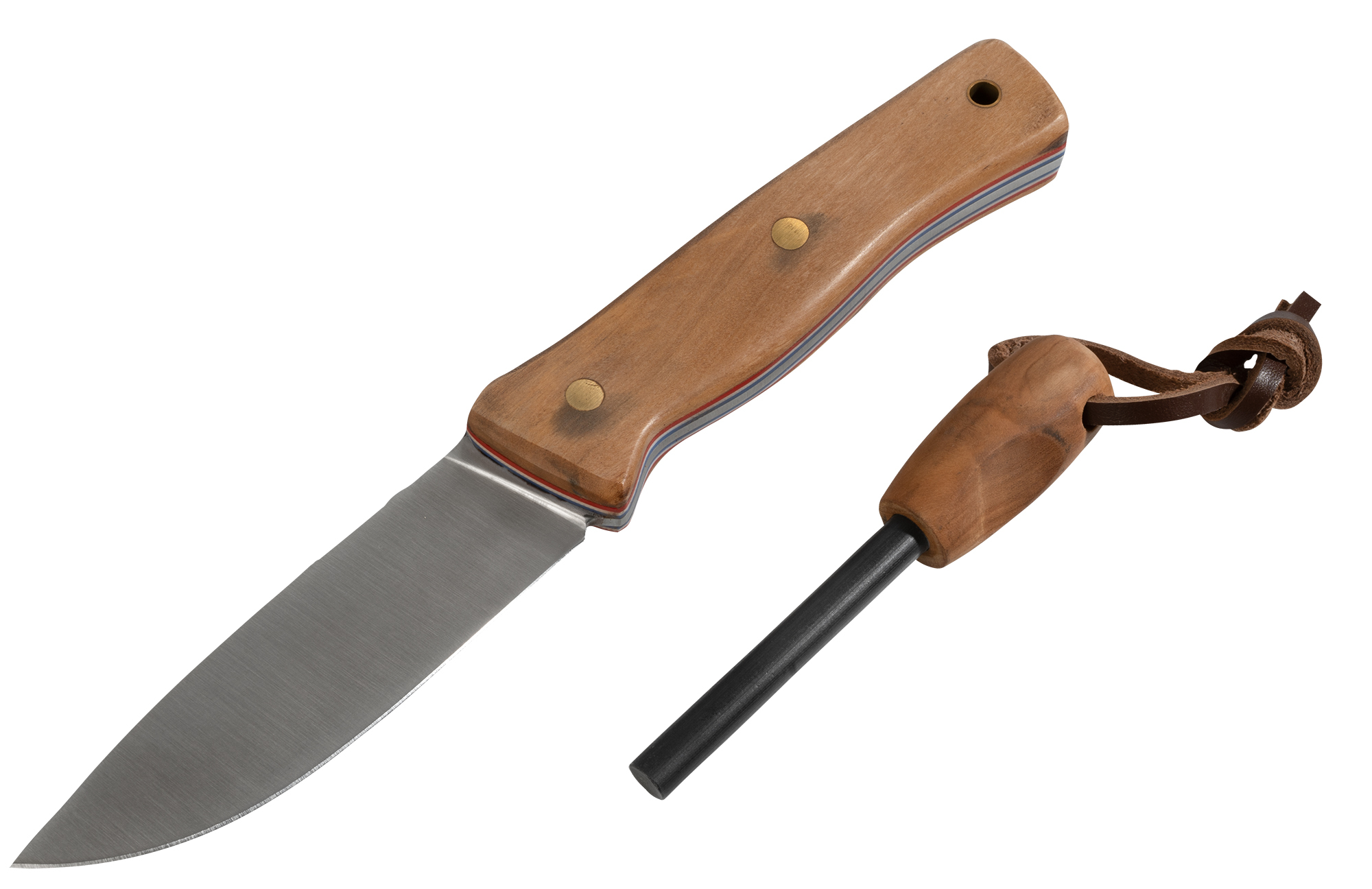 The leather sheath contains an integrated fire steel with matching olive wood shaft. The back of the blade has a small 90-degree field that provides easy spark generation. Thus, you can make fire in wind and weather.
