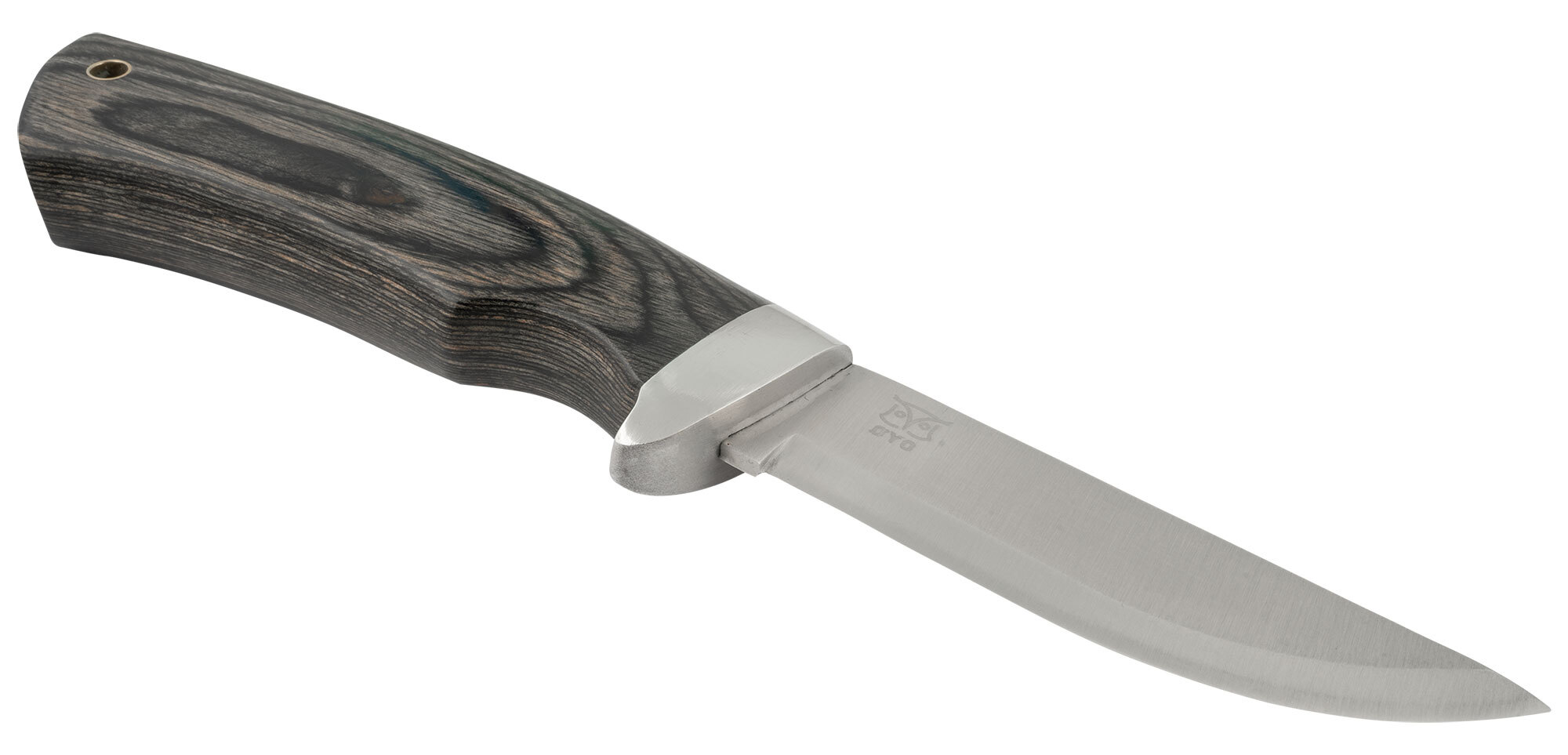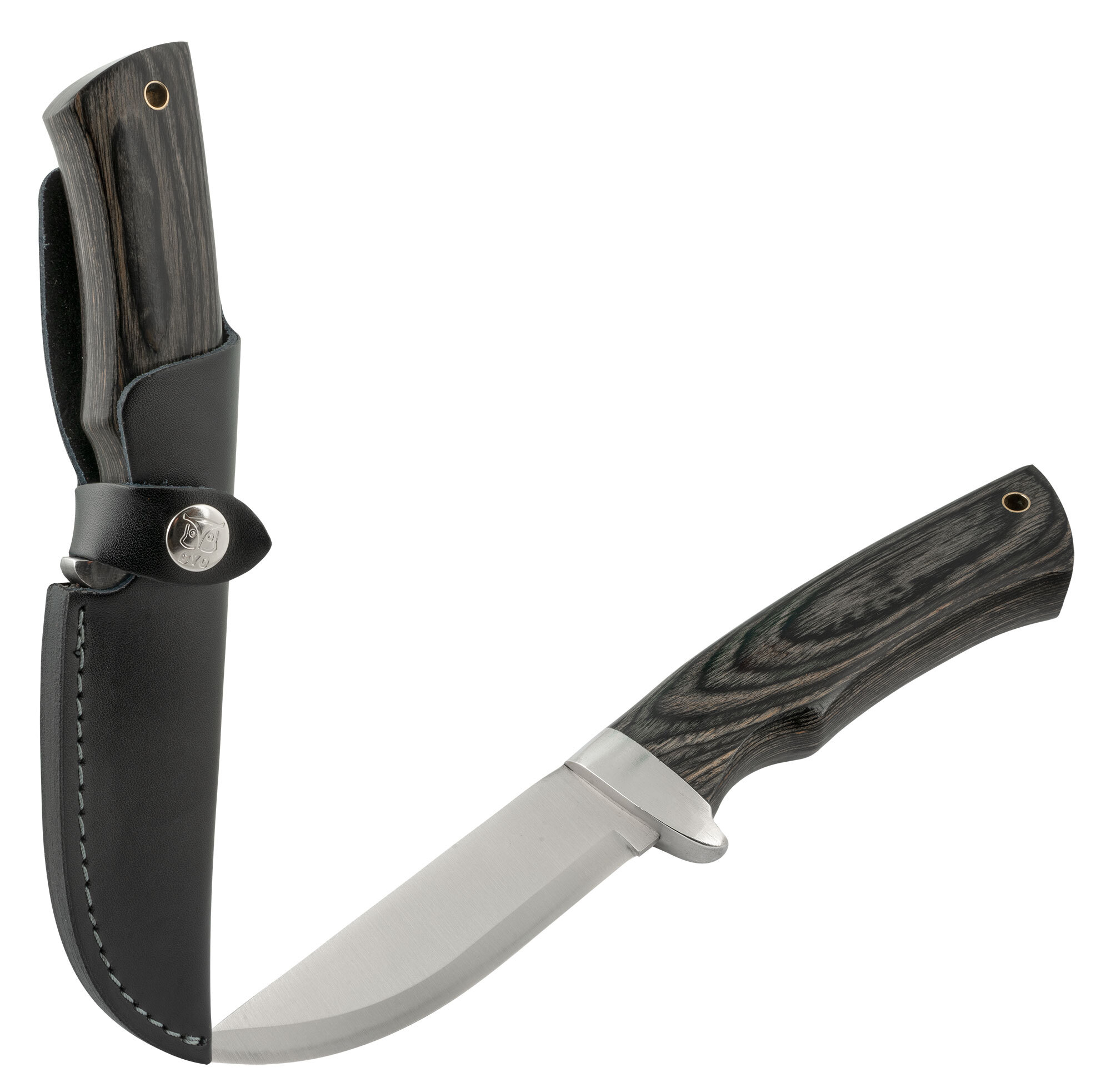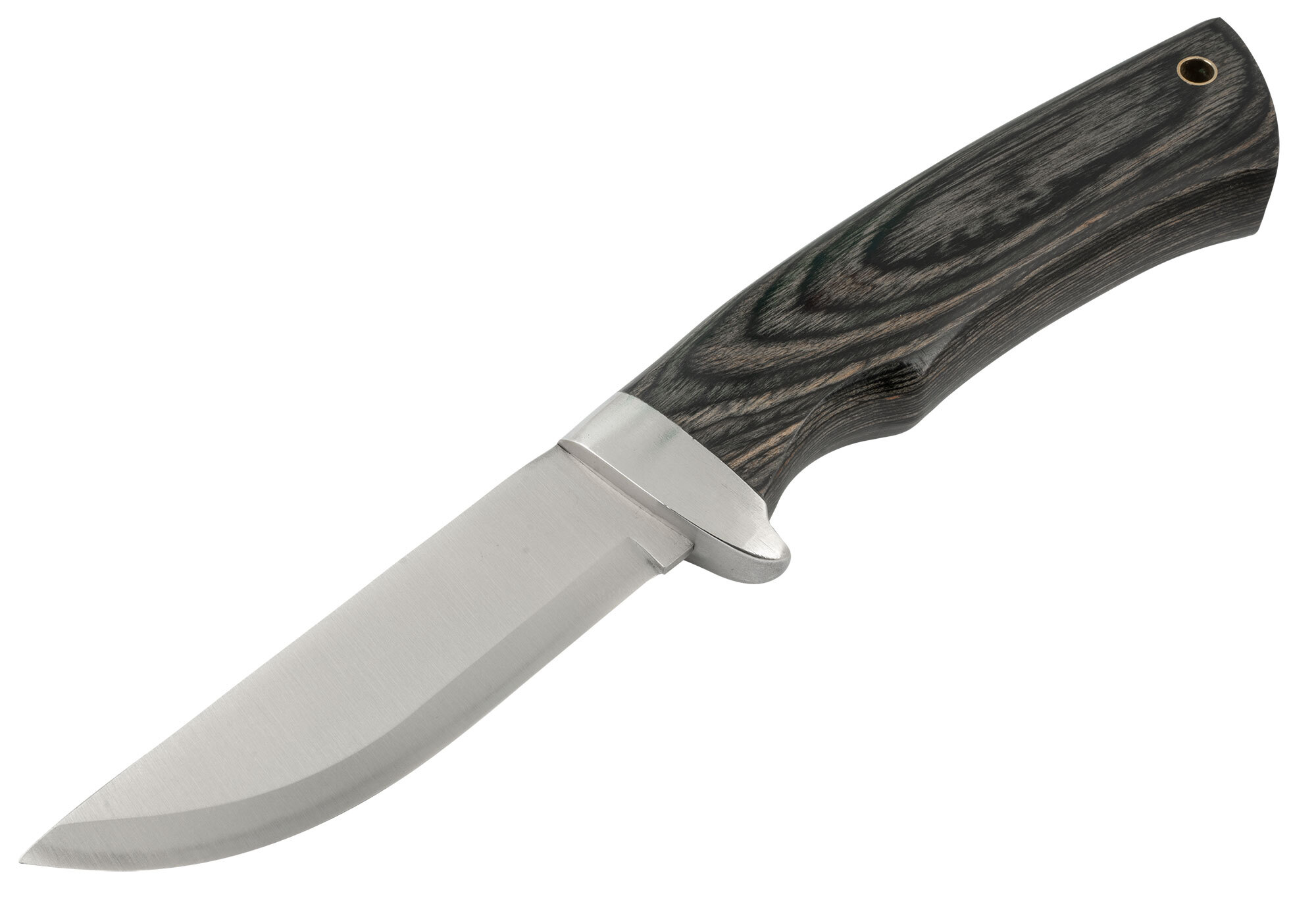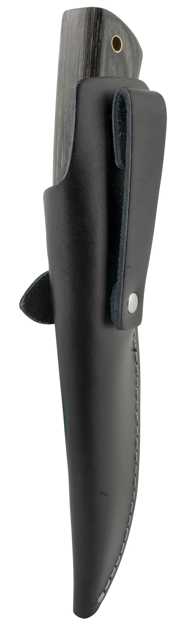 The solid shaft made of gray pakkawood is shaped so that it sits comfortably in the hand. The knife has a finger stopper to ensure you don't cut yourself and comes in a solid black