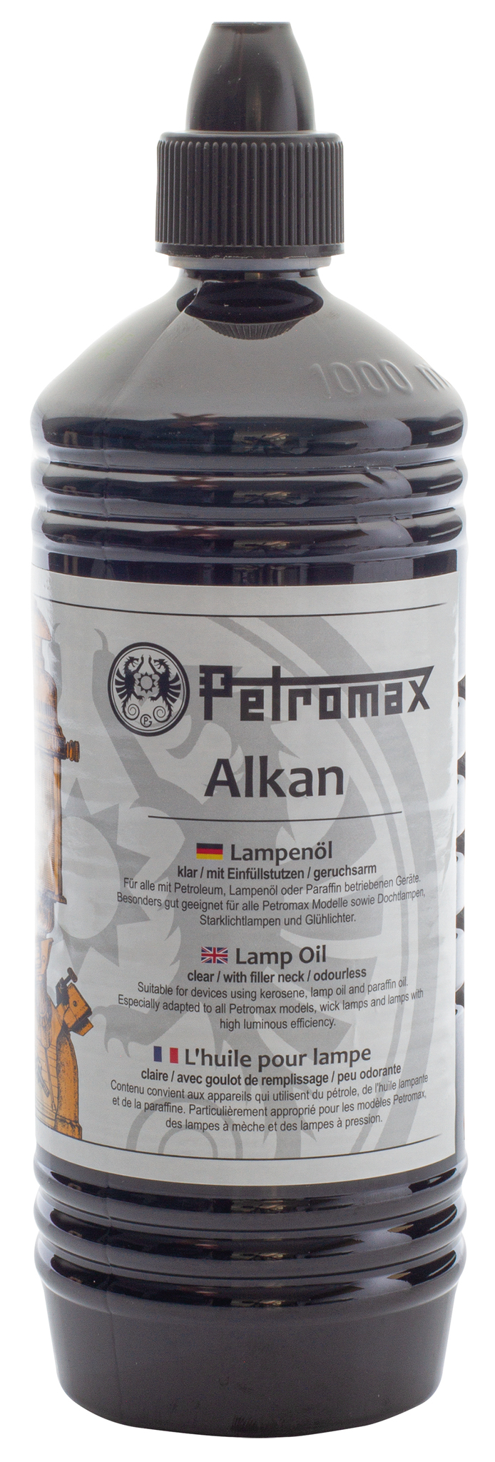 Alkan is the clear, high-purity and odorless lamp oil for Petromax lamps and storm lanterns. It is equally well suited for other kerosene or oil lamps and stoves. Due to its high purity and unique composition, Alkan burns cleanly and almost odorless. Therefore, it can be used indoors without any problems. However, good ventilation and oxygen supply should always be ensured. The handy 1-liter bottle makes filling the lamp or stove particularly easy and clean, because there is a practical filler neck on the neck of the bottle. This can also be removed if desired. The bottle cap is also equipped with a child safety lock, guaranteeing safe handling.
