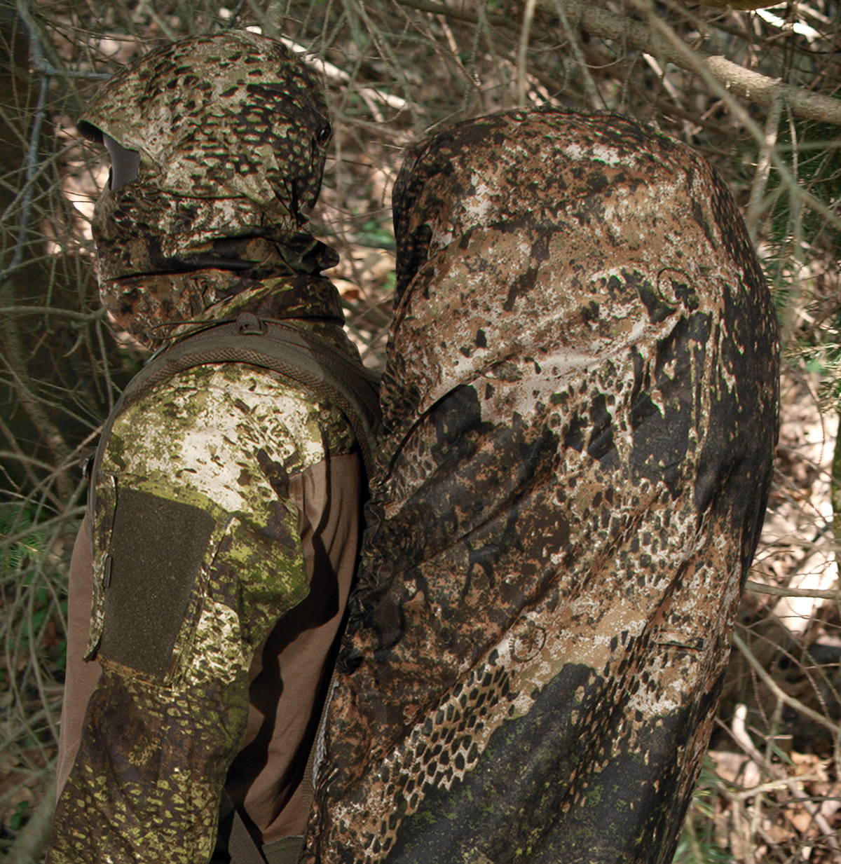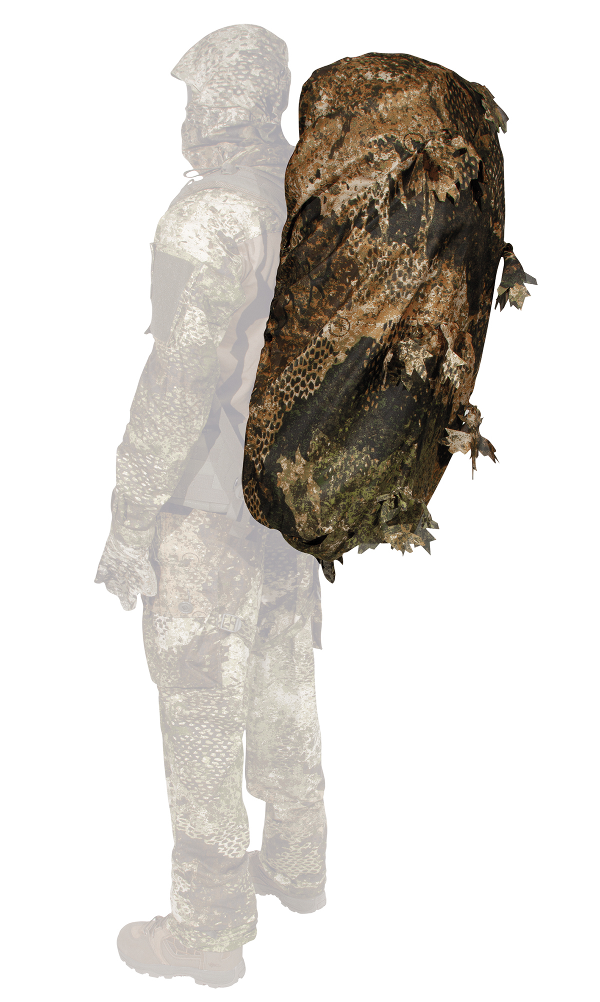 With the PHANTOMLEAF® PYTHON BACKPACK COVER G1, made of a new type of mesh material, backpacks up to approx. 120 liters or items of similar size can be camouflaged in a flash