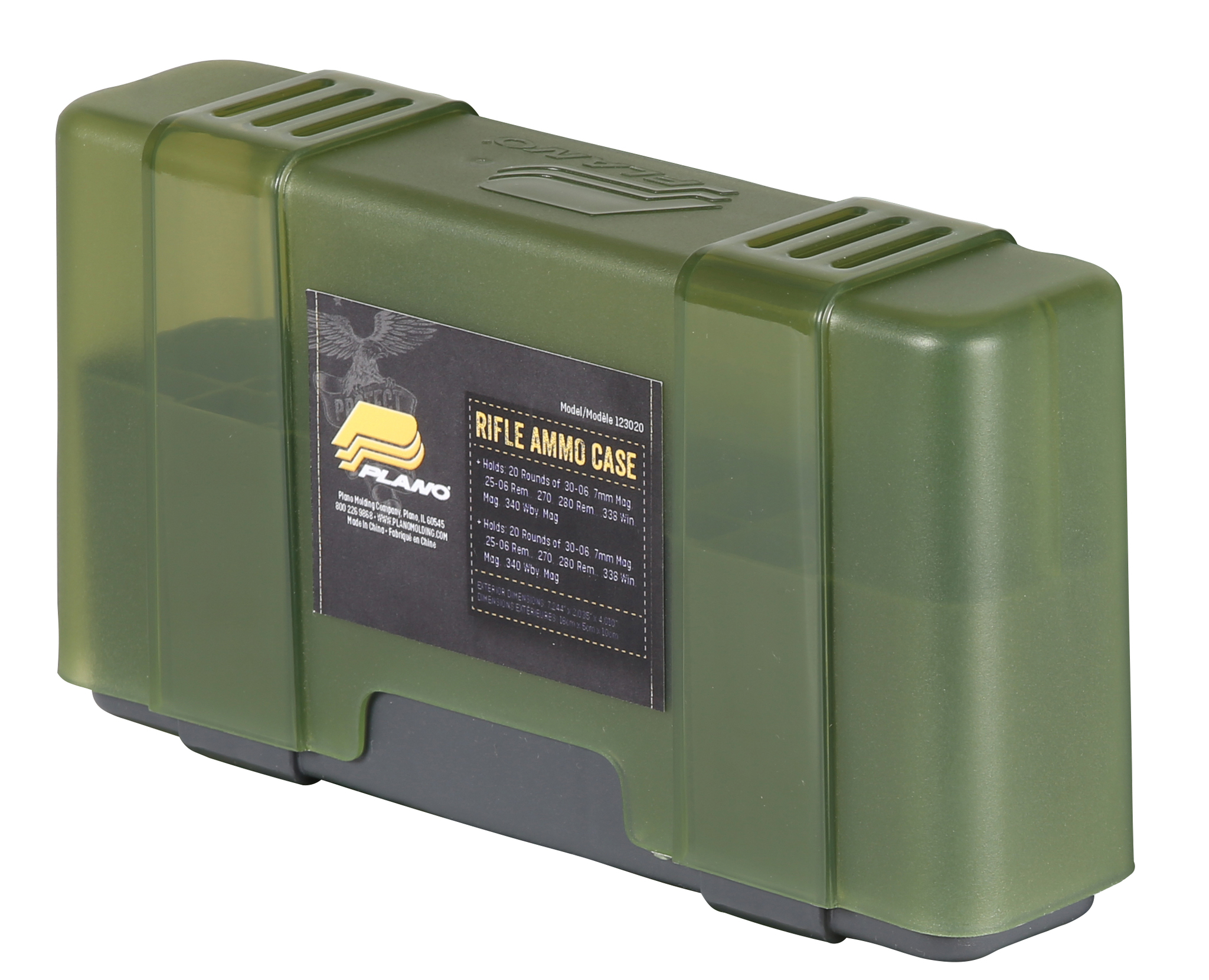 Lockable storage box from Plano for 20 cartridges long gun .30-06, 7mm Mag, .25-06 Rem, .270, .280 Rem, .338 Win Mag, .340 Wby Mag.