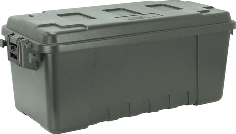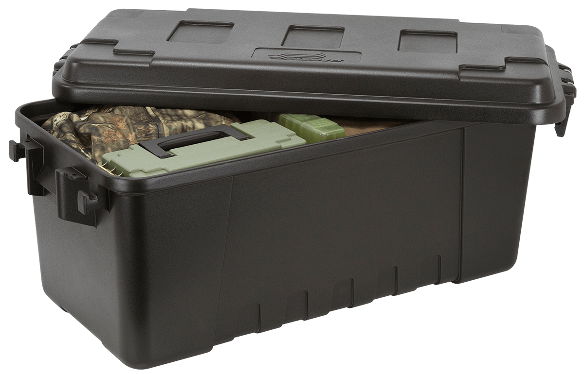 The Plano® Transport Box "Sportsman's Trunk" is made of high-impact, weather-resistant plastic and is suitable for versatile applications in the professional sector as well as for leisure activities. The completely removable lid fits snugly and closes with two heavy-duty, rust-resistant hinged latches. It also features four pre-drilled holes for attaching padlocks and "lugs" at the ends for bungees, to further secure the lid. Due to its shape, the transport box can be safely stacked on top of each other.