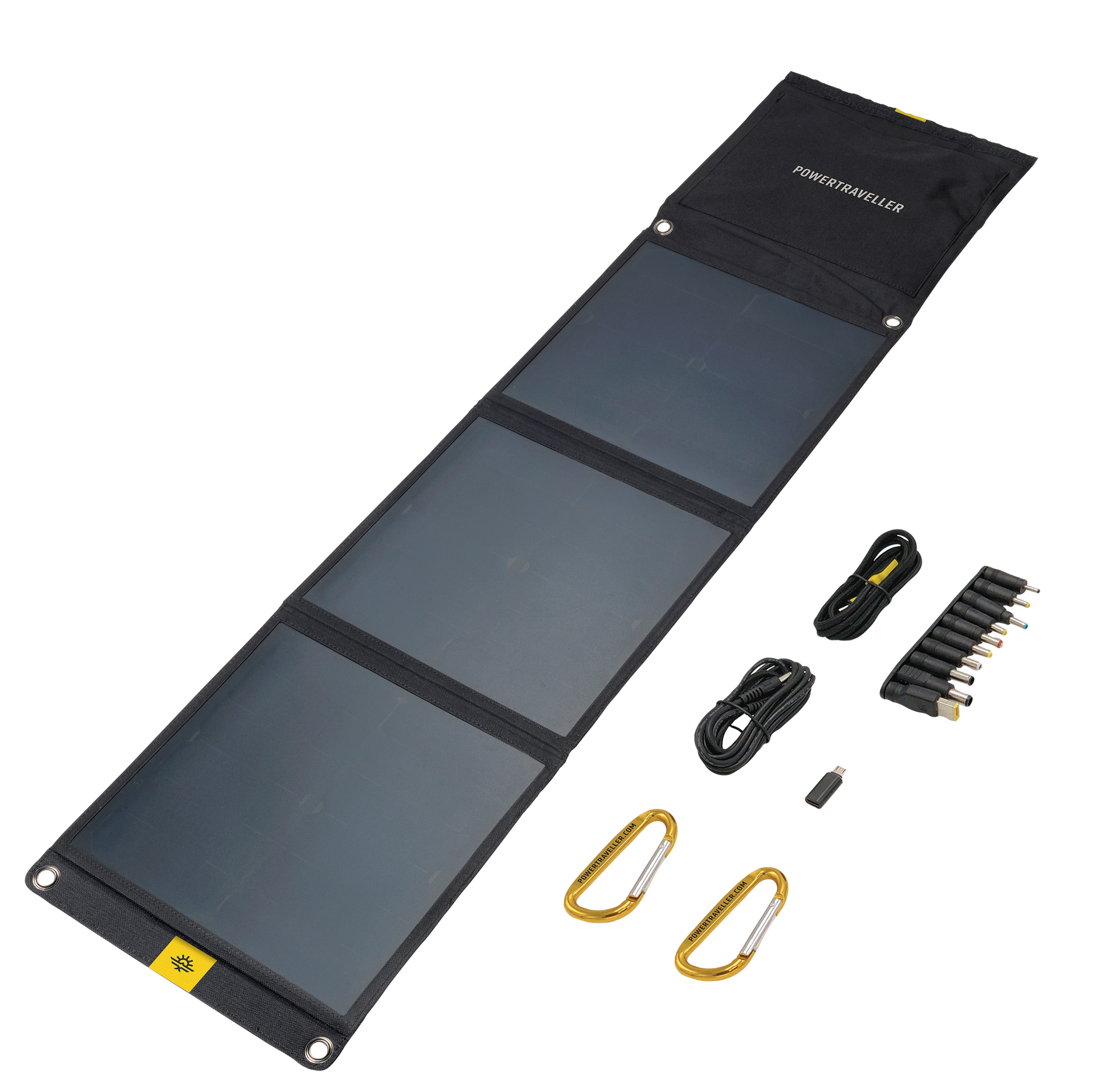Included: 1 x 40W solar panel; 1 x DC cable (2m), 1 x USB-C to USB cable (1m), 1 x Female USB-C to male Micro USB adapter, 1 x Laptop tips set (10 pieces), 1 x 12V car jack, 2 x aluminum carabiner.