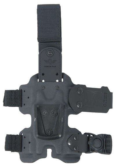 The design of the unlined Kydex leg carrying plate is compact and provides for it to be worn in a high position on the leg. The connection to the duty belt is made by a semi-rigid technopolymer piece, which is provided with webbing and Velcro to ensure easy attachment and detachment.
