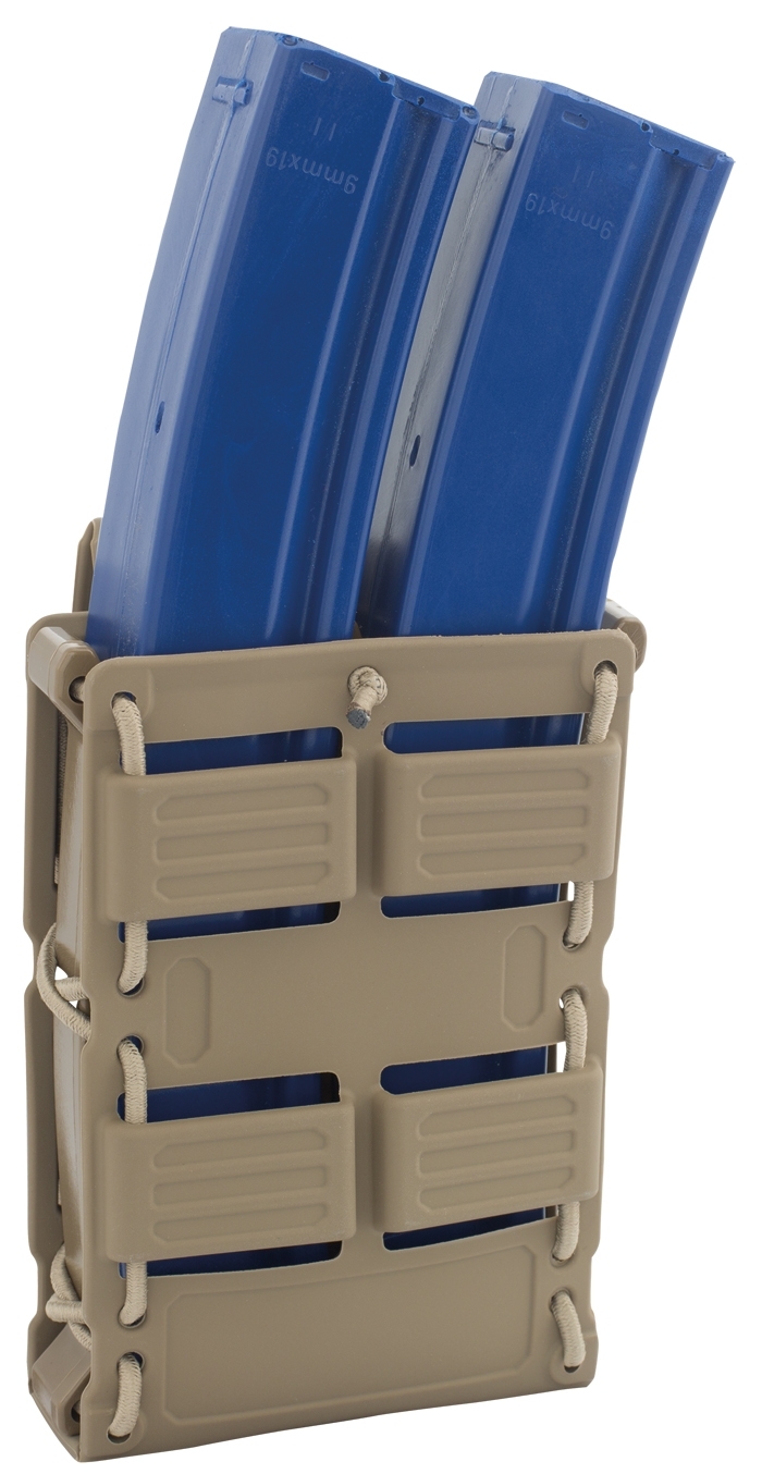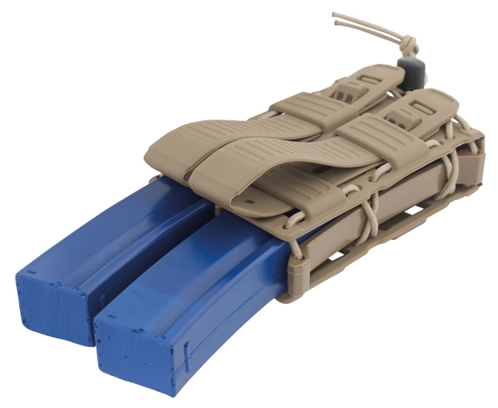 Modular Radar magazine pouch for 2 MP5/ MP7 magazines made of super flexible and extremely robust RubberTech material and reinforced with plastic on the sides. The draw resistance can be individually adjusted by means of the bungee cord. The bag can be attached to modular carriers with two MOLLE/PALS attachment loops.