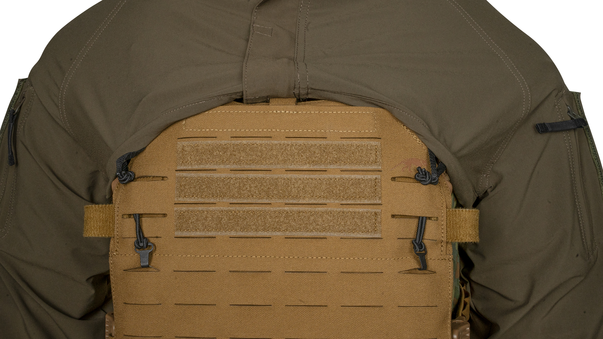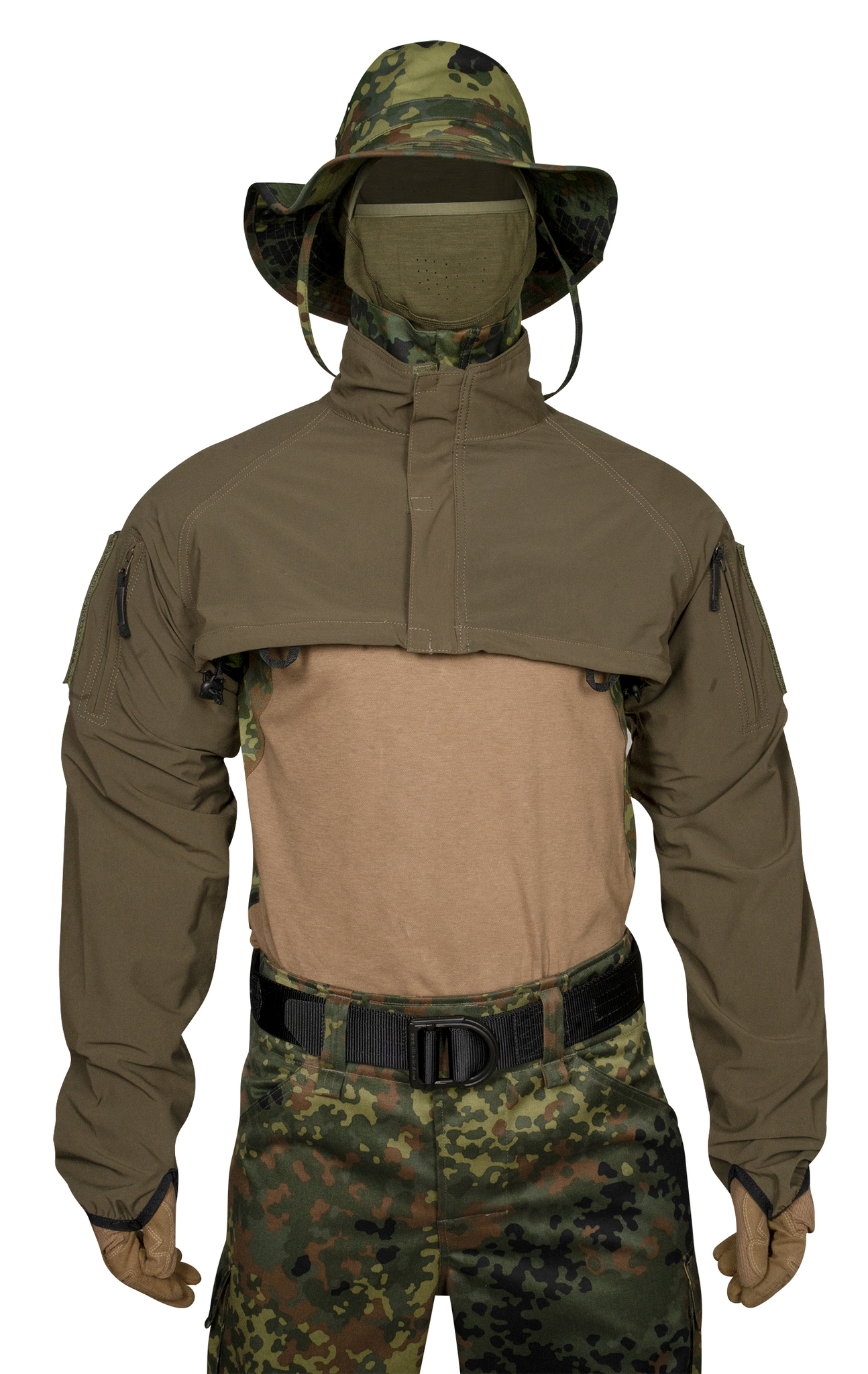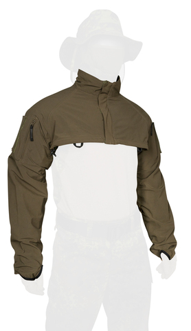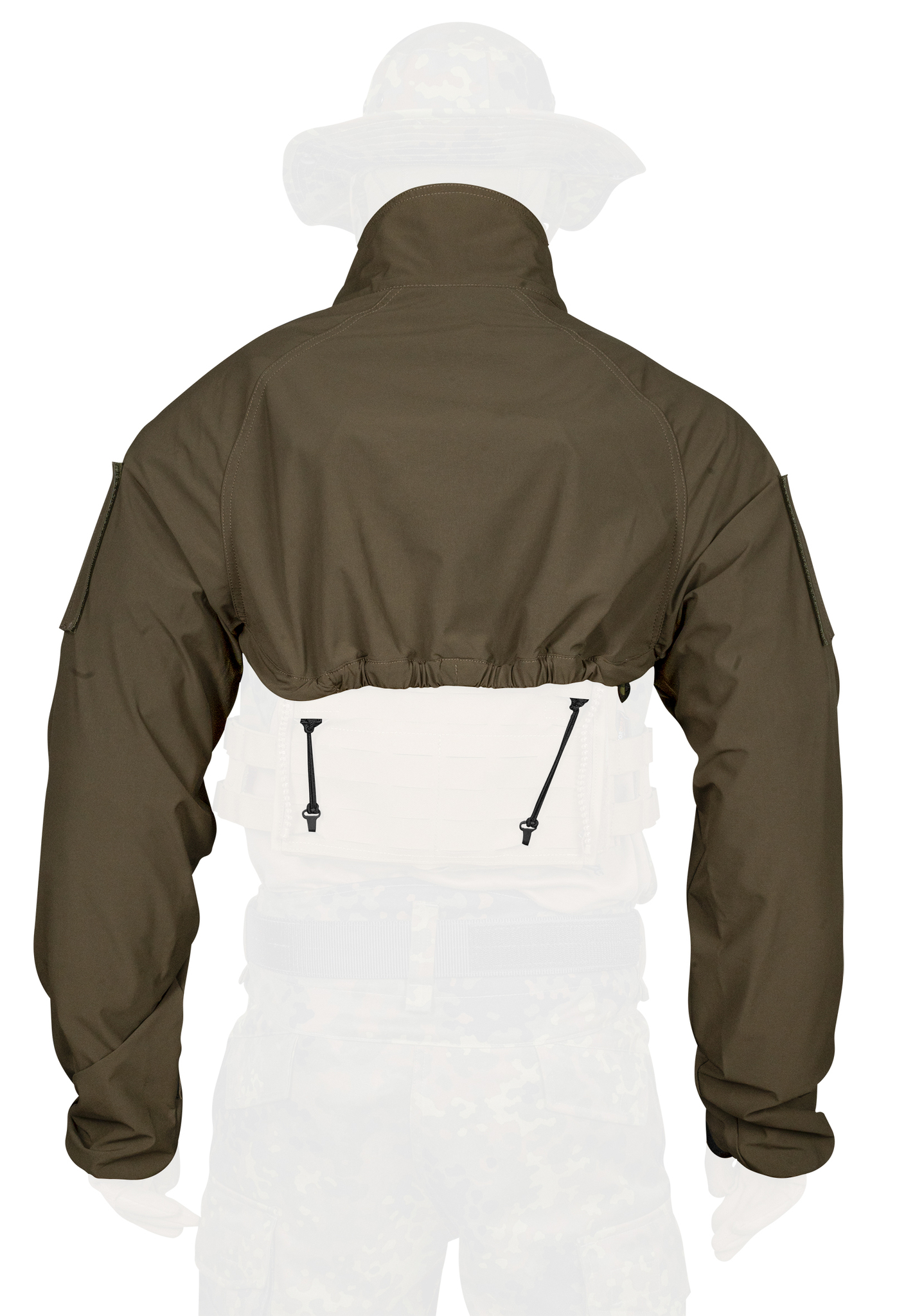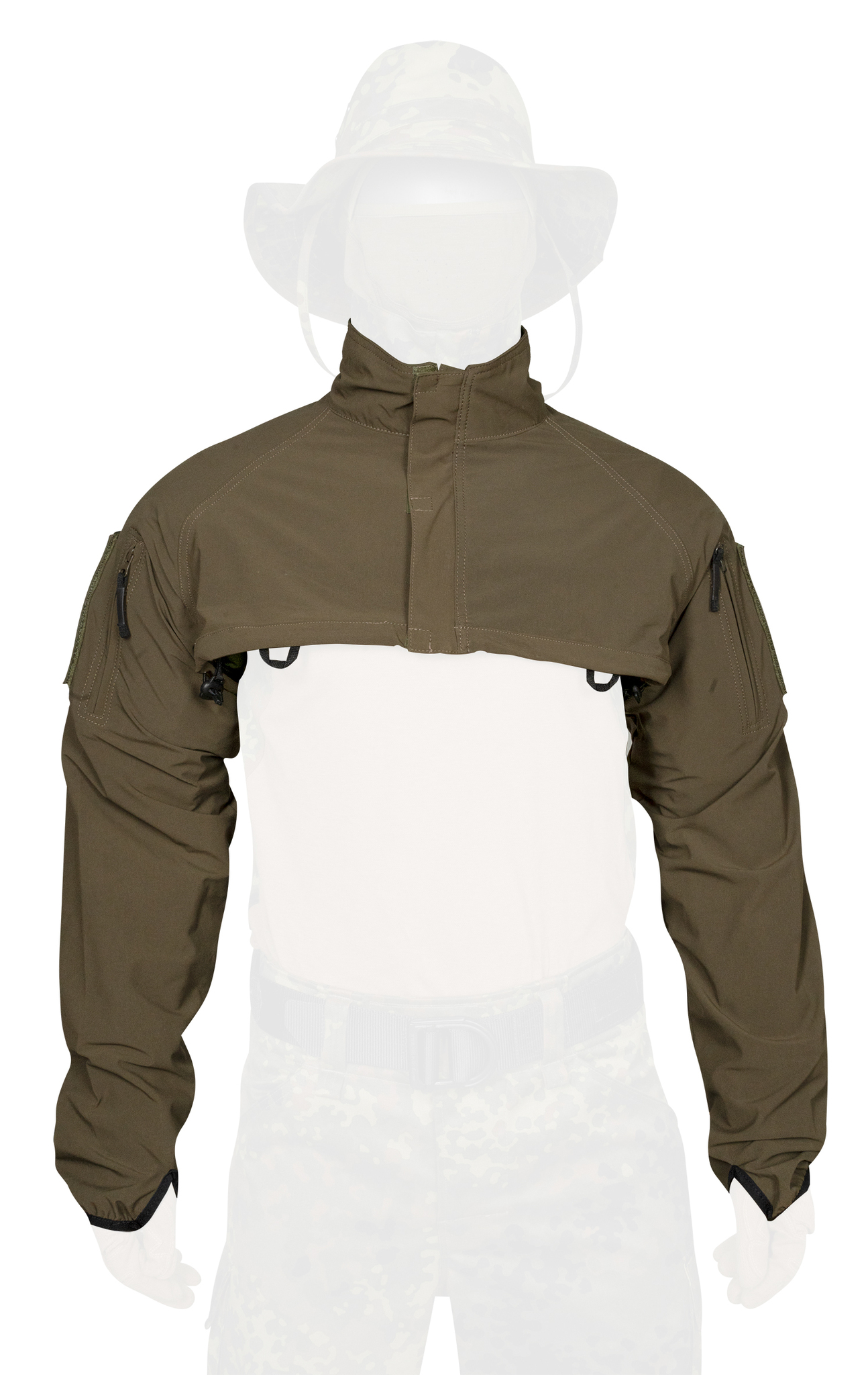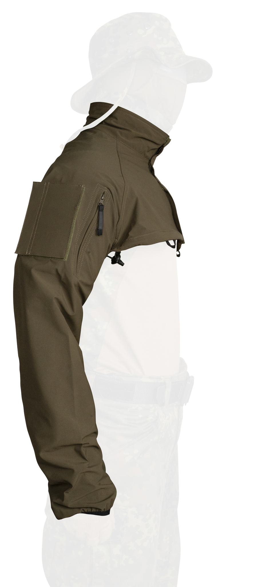 The minimalist details also help to keep the weather at bay. The front zipper can be adjusted quickly, as can the hem with an elastic drawstring and the elastic cuffs with thumb holes. Stretch inserts between the shoulders increase freedom of movement. The upper arm zippers can be used as ventilation, but allow access to pockets underneath. The Bolero is cut so that you have full access to your plate carrier and can also be attached to it using the bungees and hooks supplied. Large covered Velcro area with glow stick garage for easy friend or foe identification.