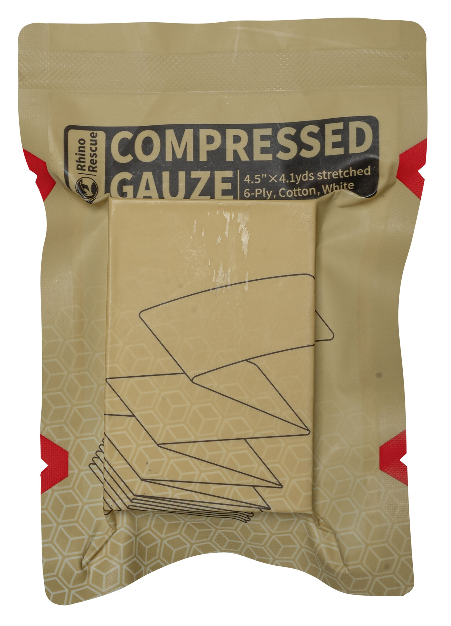 The Rhino Rescue Compressed Gauze is a sterile 6-ply woven absorbent cotton gauze for the management of heavily bleeding wounds.