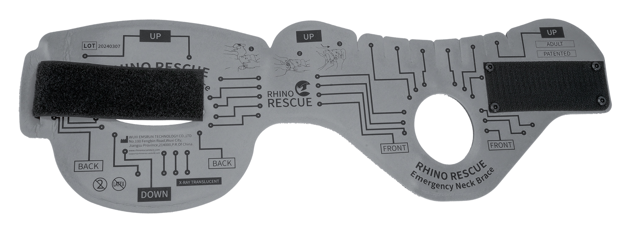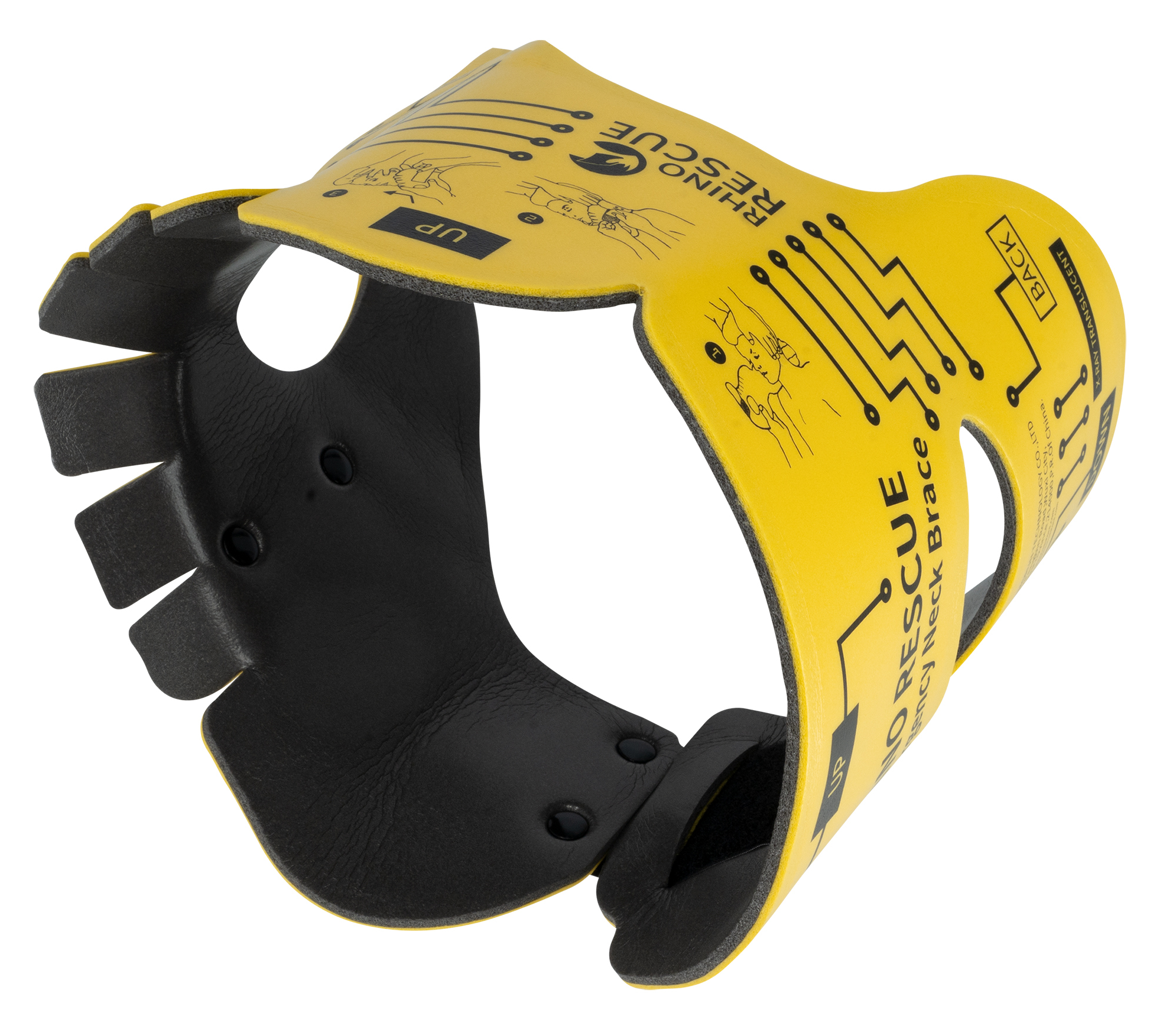 Neck brace and neck collar from Rhino Rescue for treating injuries in the cervical vertebrae area - the foldable support is put on after treating any wounds in order to transport or secure the injured person for further treatment.
