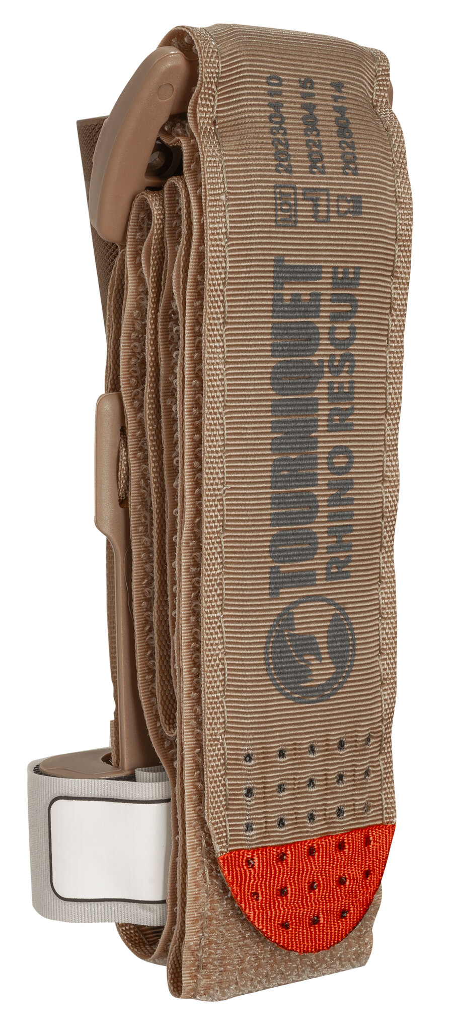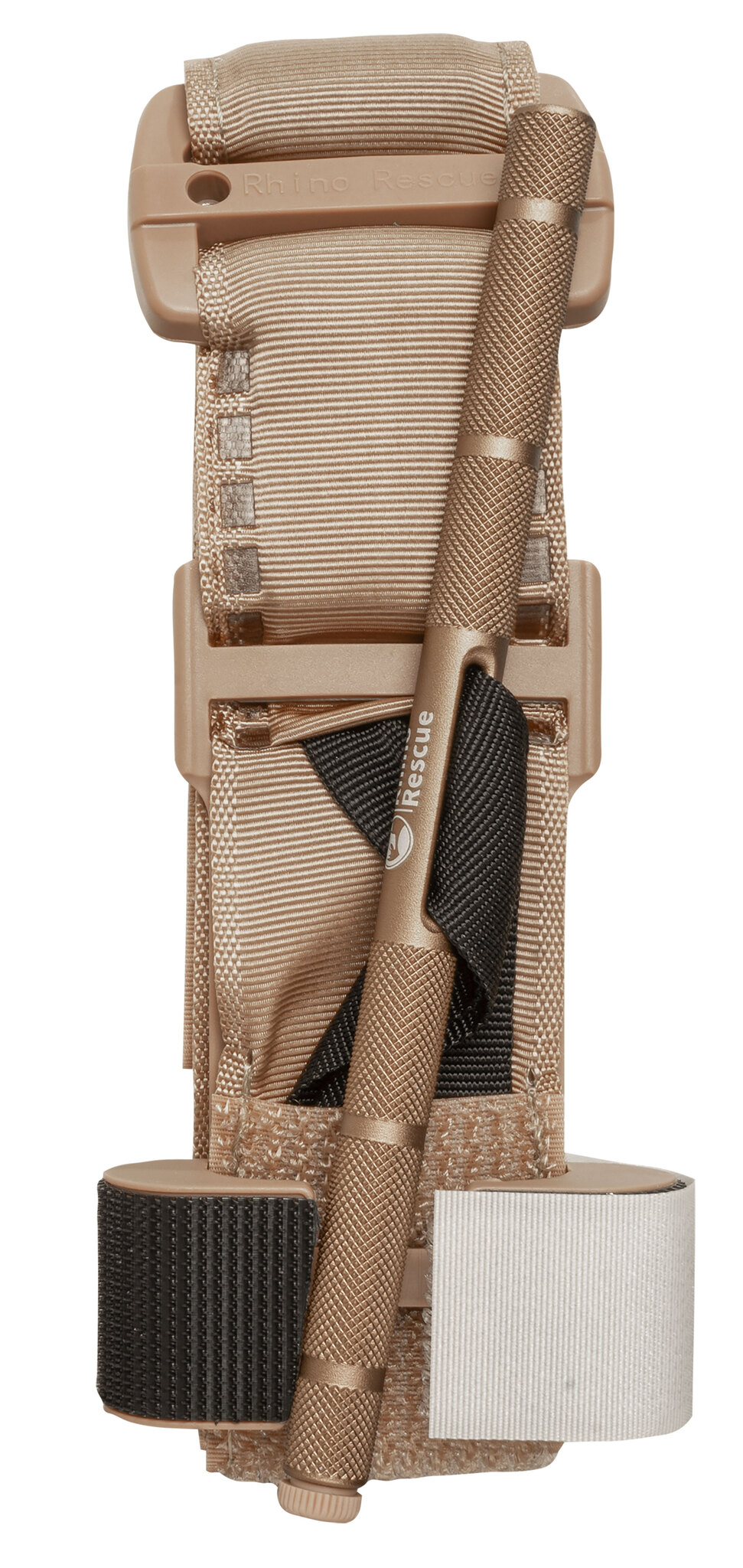 The Rhino Rescue Tourniquet is a one-hand tourniquet system for tourniqueting or briefly interrupting blood flow in emergency situations, especially in tactical wound care. An individually adjustable velcro strap allows the tourniquet to be applied to all extremities.