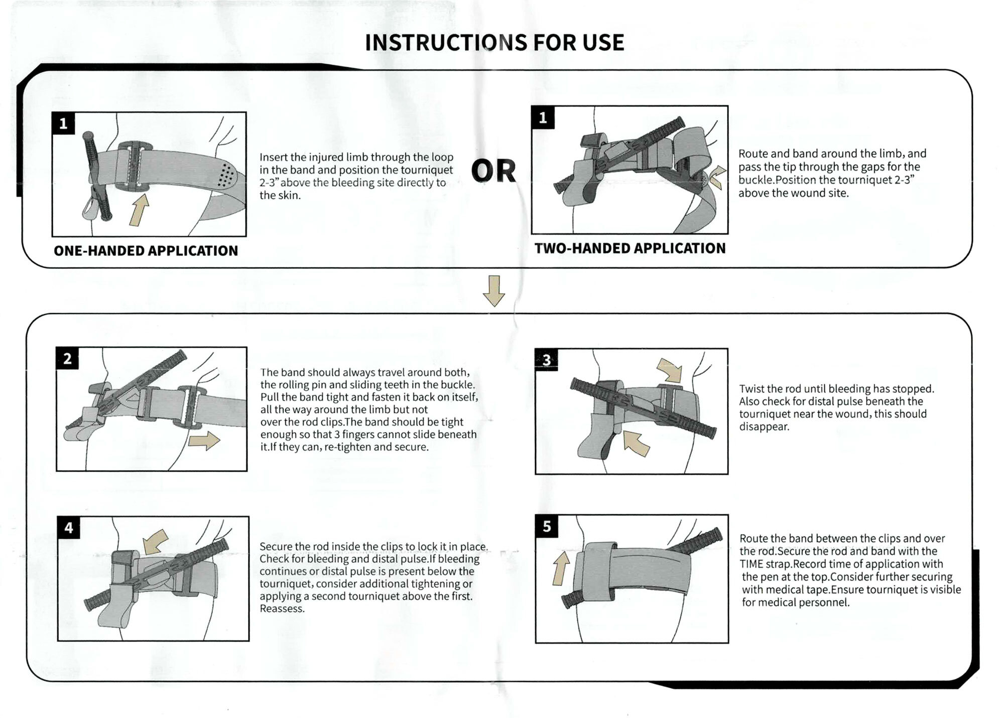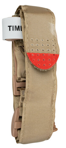 The twist/wind system uses a free-moving internal band to stop the flow of arterial blood to a limb. To fix the toggle in the U-shaped anchor clip, only one handle is needed. For transport, the toggle is securely fixed by a Velcro fastener. The Velcro fastener serves as a labeling field for documenting the time of tying.