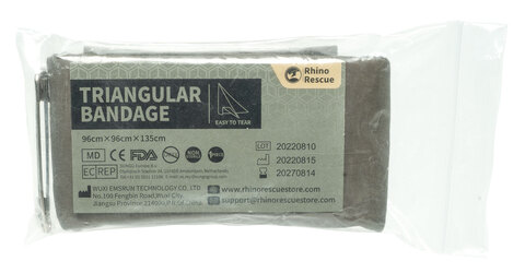 The Rhino Rescue Triangular Bandage is a robust triangular bandage made of 100% viscose according to DIN 13168 for the fixation of bandages and for short-term immobilization of the forearm.