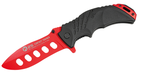 The training folding knife allows martial artists and trainers to practice and train the use of knives safely and without injury. The stainless steel dummy is immediately recognizable as a trainer since RED coated. The plastic handle scales give the knife an optimal balance.