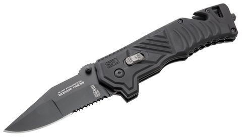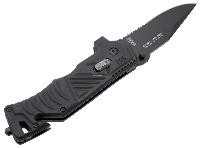 RUI one-hand knife 19377 with partial serrated edge, belt cutter and glass breaker.