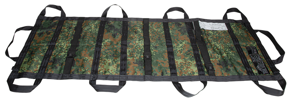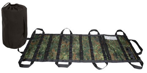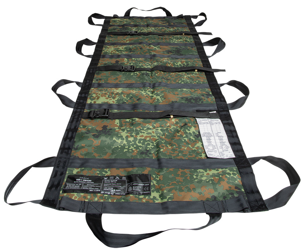 The scale TES-1 ZEKON is a lightweight and extremely robust recovery sling for safe transport in an emergency. The cover of the stretcher is made of robust cotton canvas with carrying loops and reinforcements made of 5 cm wide webbing. The portable stretcher has six side carrying loops and one loop on each side of the head for any necessary pulling of the injured person out of the given emergency situation. With the adjustable safety straps on the inside, the person in distress can be easily and quickly fixed. The recovery sling can be conveniently folded, rolled up and stowed in the pack sack. It requires little space and can be stowed very well, it fits perfectly in vehicles and first aid cabinets. Outer fabric in 5-color camouflage print according to TL 8305-0290 of the Bundeswehr.
