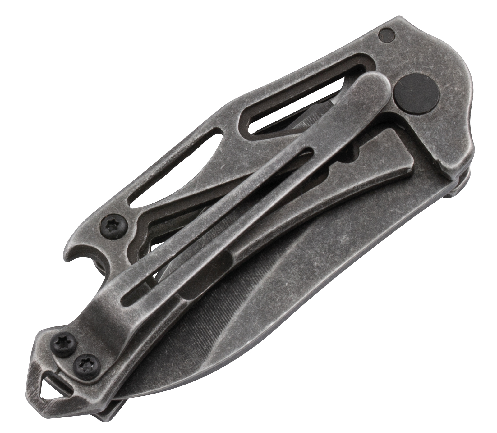 Completely stonewashed, this keychain-sized Smith & Wesson pocket knife is lightweight and small, but offers a variety of useful features. The 3Cr13 stainless steel blade is easy to open and locks in place with a frame lock. Despite the use of stainless steel for the handle scales, the knife has only a low weight thanks to the skeleton construction. Additional extras include a bottle opener integrated into the handle, a belt clip and the included key chain.