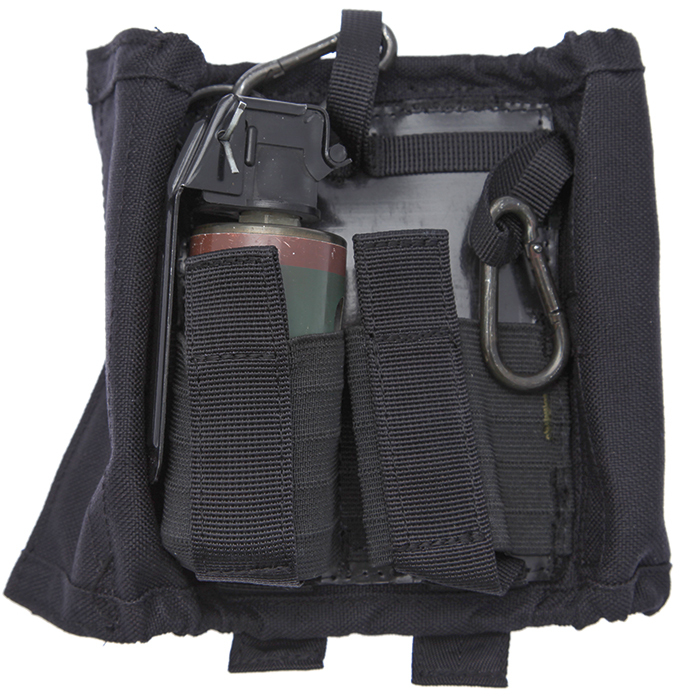 The SnigelDesign Dual Strun Pouch is a modular pouch for two stun grenades. The pouch has two loops with snap hooks to which the safety pins of the grenades can be attached. This allows the grenade to be unlocked when pulled out.