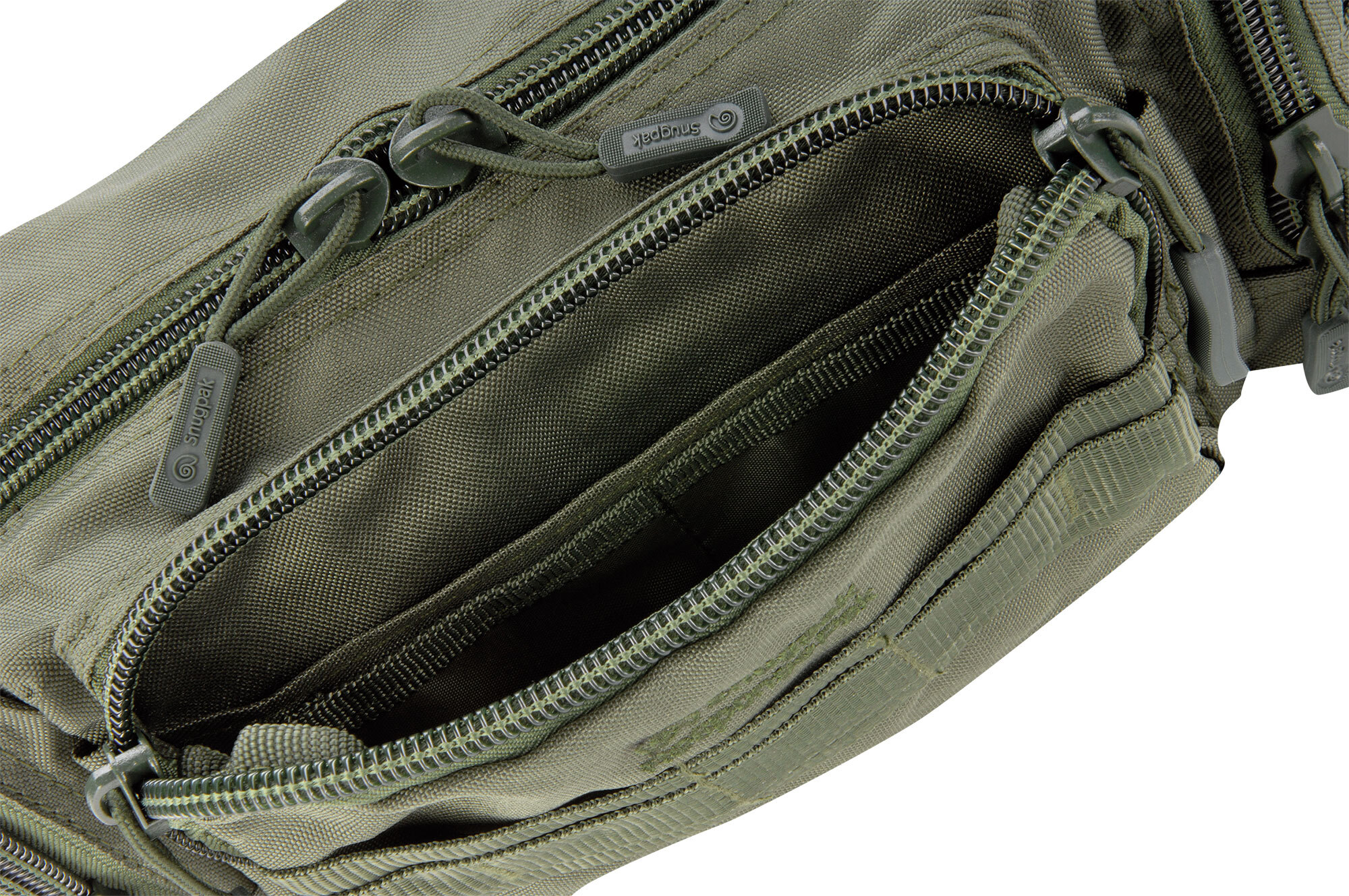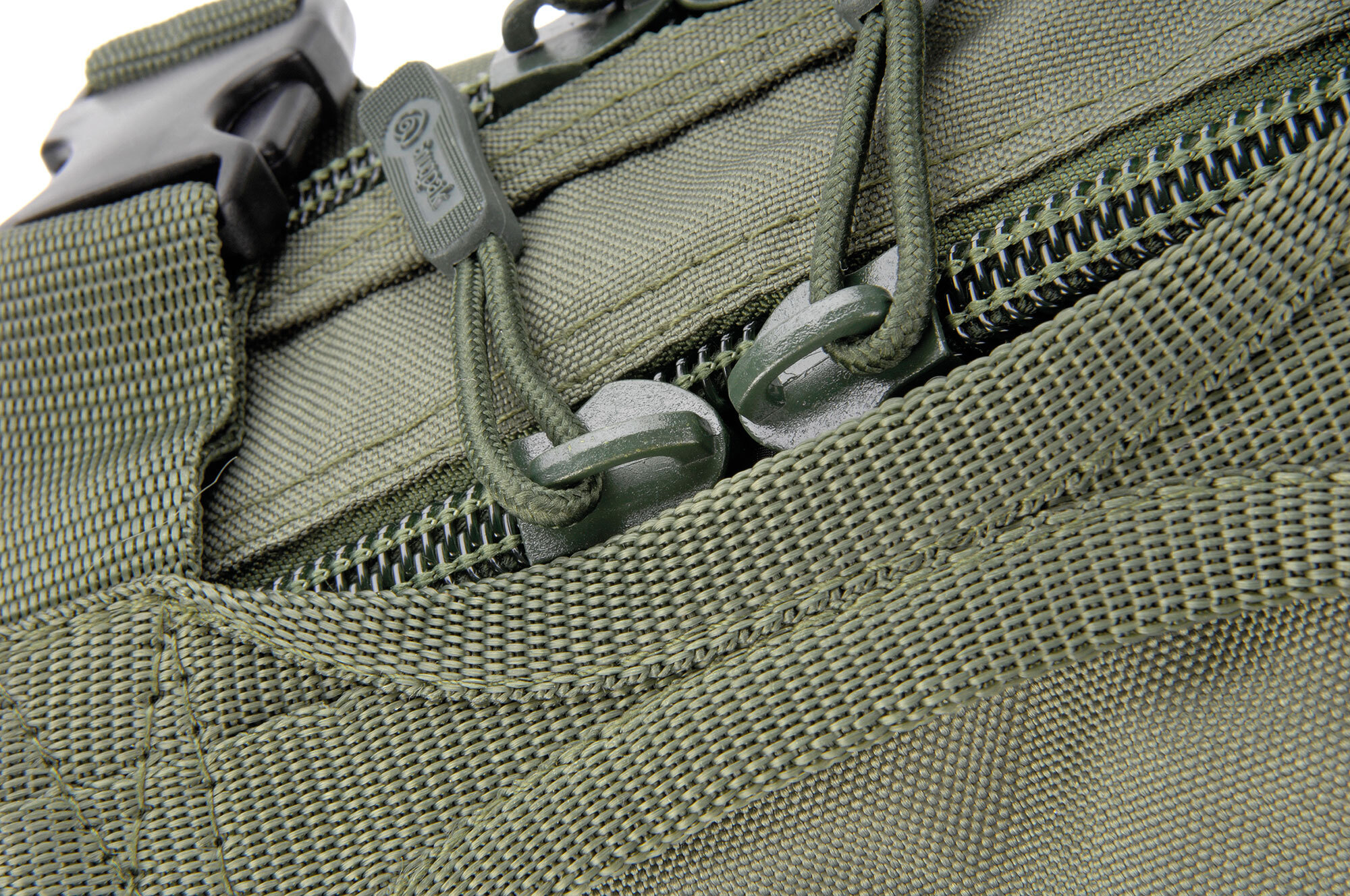 PALS attachment loops with snap closures to attach the bag to MOLLE webbing or to wear on a belt.