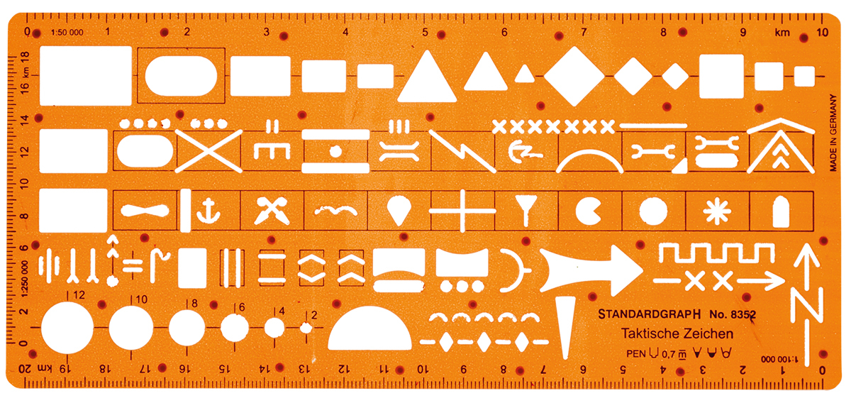 NATO standardized signs for units, offices, command posts, persons, weapons, equipment, installations and facilities. For fine-fiber pens "S" as well as ink pens 0.6 mm and fine-lead pens.