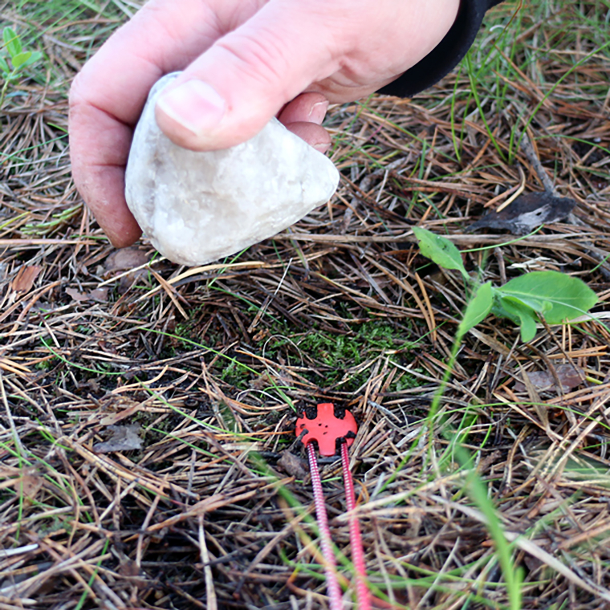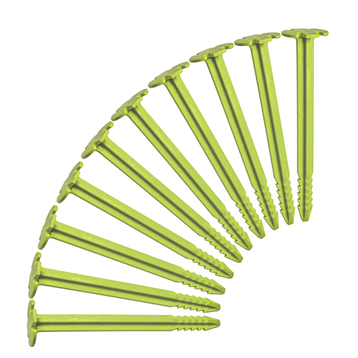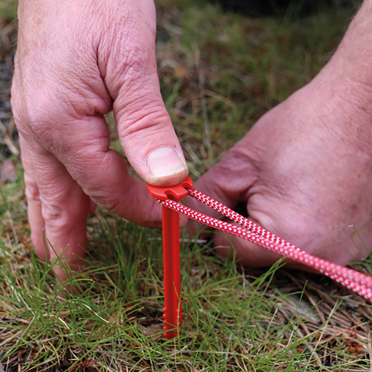 The GreenShark tent pegs are made of 100% PirahnaBT, a bio-based plastic of plant origin, and are absolutely GMO-free. Innovative and naturally made in Switzerland, they offer distinct advantages over conventional metal tent pegs: they are ultra-lightweight and particularly foot-friendly thanks to their flat profile.Their tapered shape makes them easy to hammer in, while an x-shaped cross-section with a sawtooth profile ensures a secure hold in a wide variety of soils. The flat head compresses the ground and maximizes holding power. Notches reliably hold the tent lines in place and provide the best anchoring. Since SwissPiranha tent pegs are completely sunk into the ground at a 90° angle, the risk of injury is reduced to zero and there are no sharp edges to damage the tent fabric. Of course, discarded GreenShark tent pegs can be recycled - they are biodegradable and compostable.
