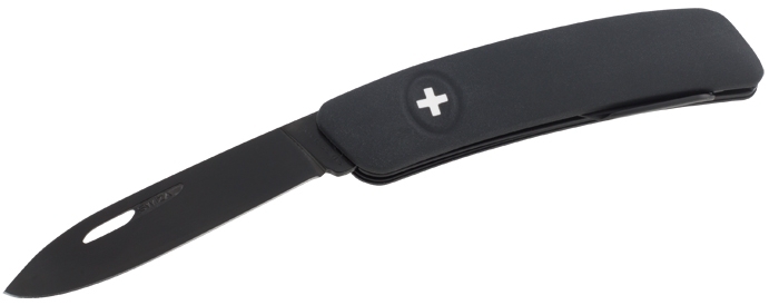 The authentic Swiss Army Knife SWIZA® D01 All Black with a highly resistant, deep black high-tech coating of polytetrafluoroethylene (PTFE). Thanks to the curved shape, it fits perfectly in the hand and together with the safety lock (locks and deblocks by pressing the Swiss cross) of the 75mm blade, safe work is guaranteed