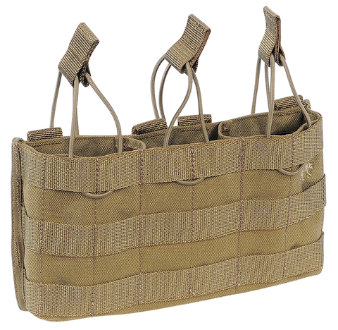 The Tasmanian Tiger 3 SGL Mag Pouch BEL G36 MKII is a short magazine pouch for three H&K G36 magazines (side by side), secured by bungee cord. The pouch is secured using the silent and robust MOLLE reverse system made of Hypalon.
