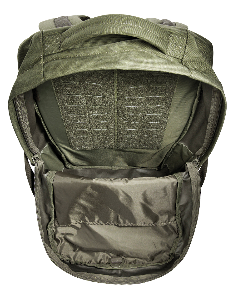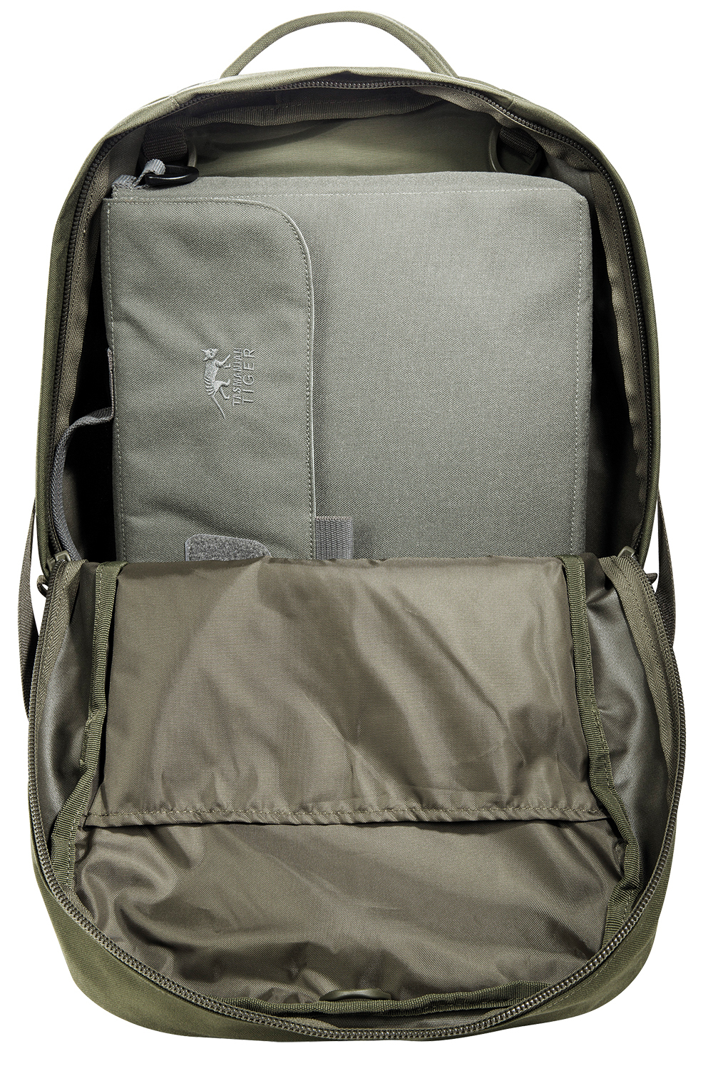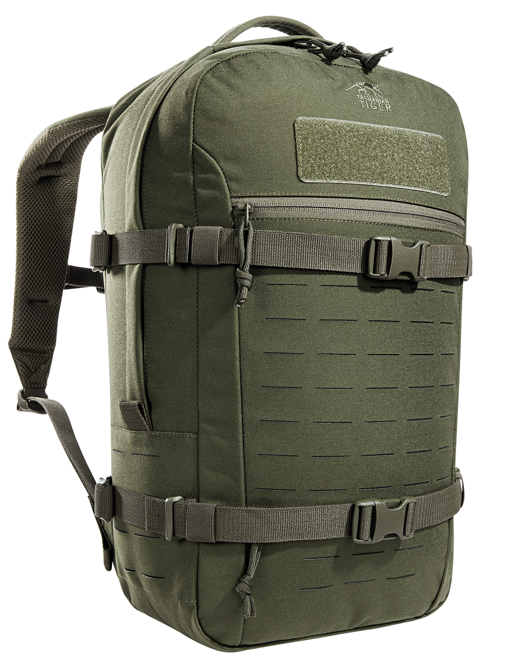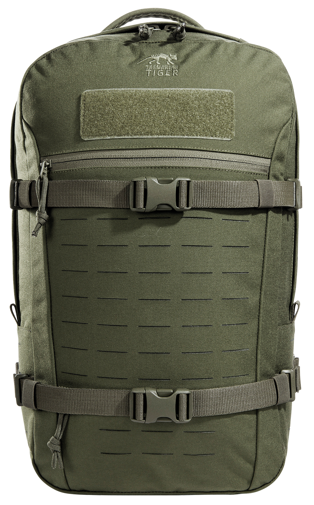 Modular daypack from Tasmaian Tiger with 23 liter volume. The main compartment of the daypack is covered with MOLLE Velcro on the inner back panel and thus allows the equipment with Velcro pockets. It is also sized to hold a 15.4" laptop. The shallow zippered front compartment is suitable for document storage,