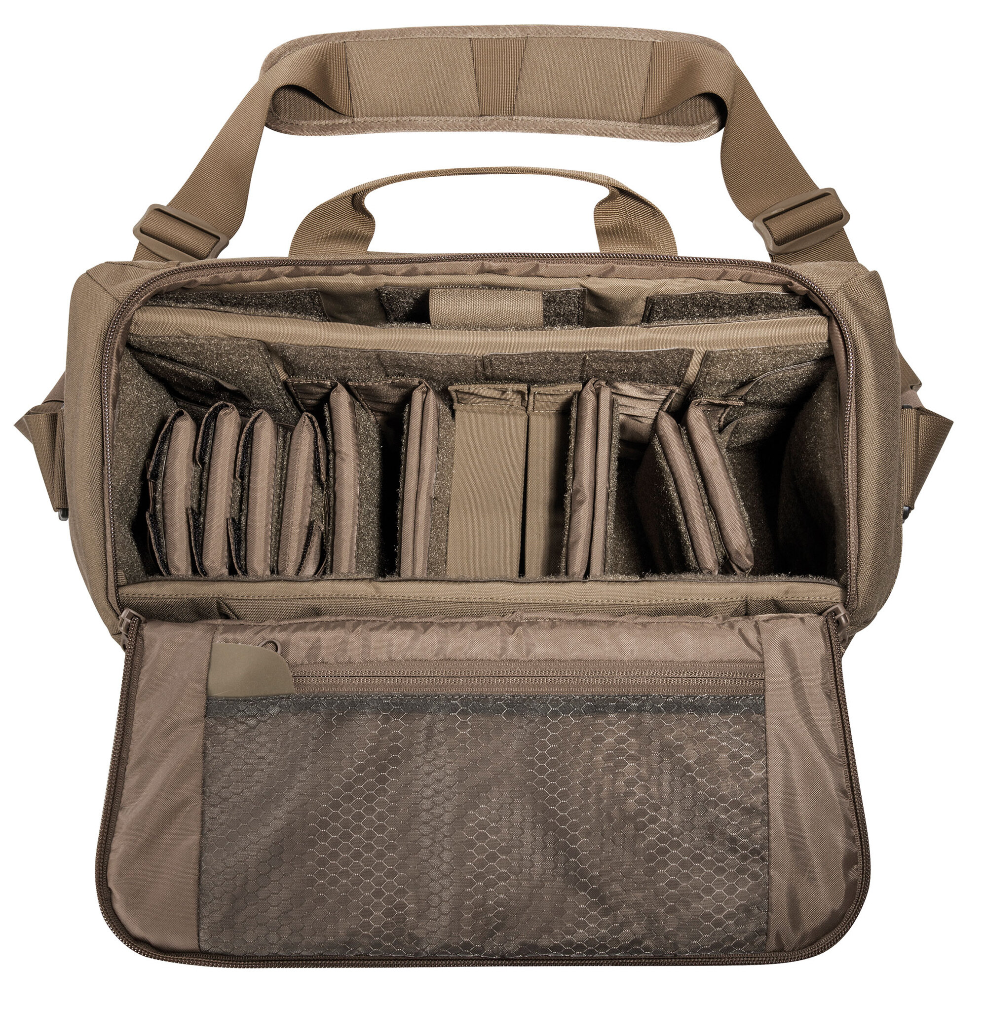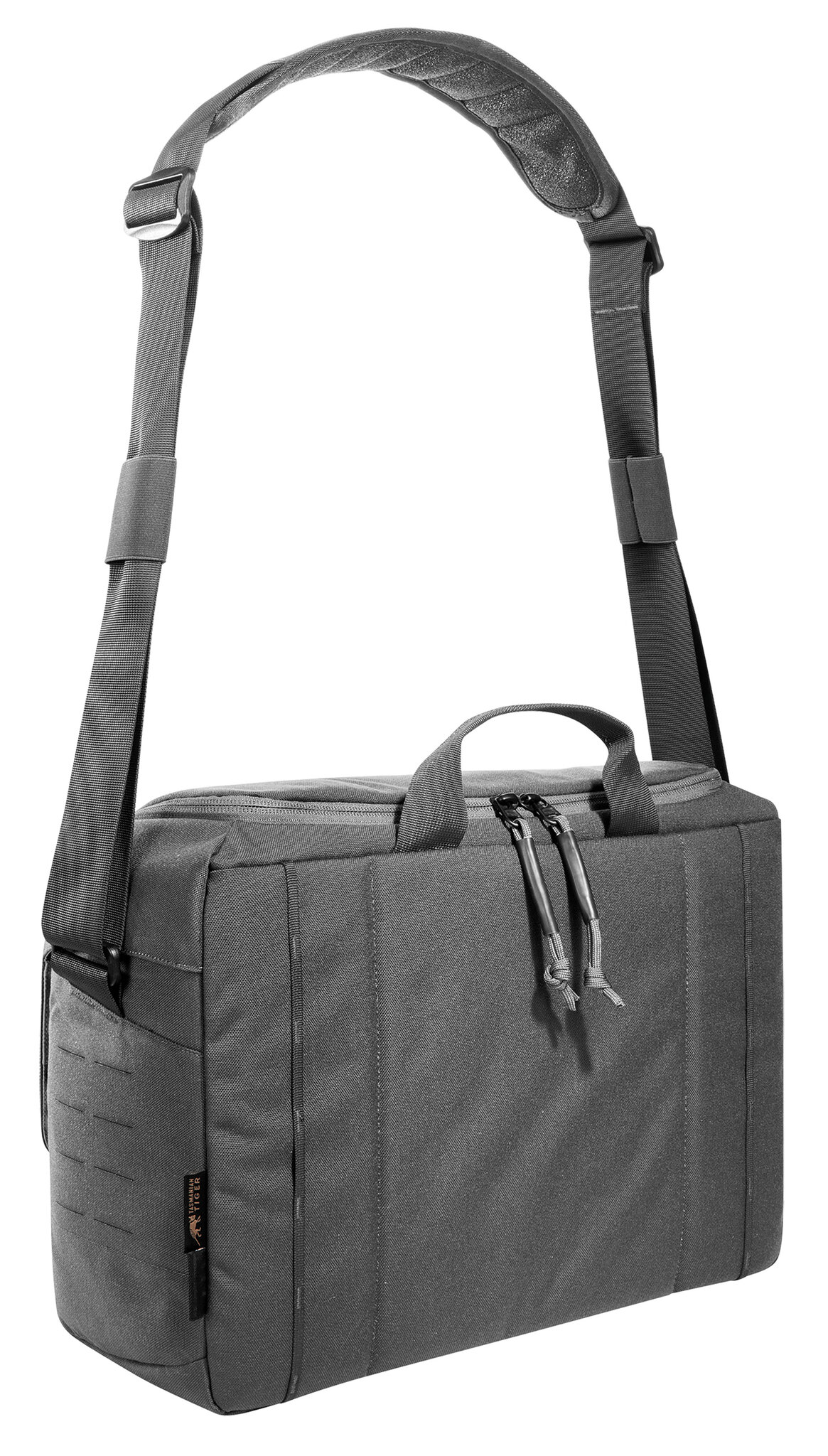 All around padded shoulder bag. The Tasmanian Tiger Modular Equipment Case is internally covered with a large MOLLE Velcro area and equipped with flexible-use padded dividers. The separate, width-adjustable laptop compartment can also be used as a weapons compartment. The flap is secured with Velcro and quick-release buckles. Extra zipper allows quick access from the top.