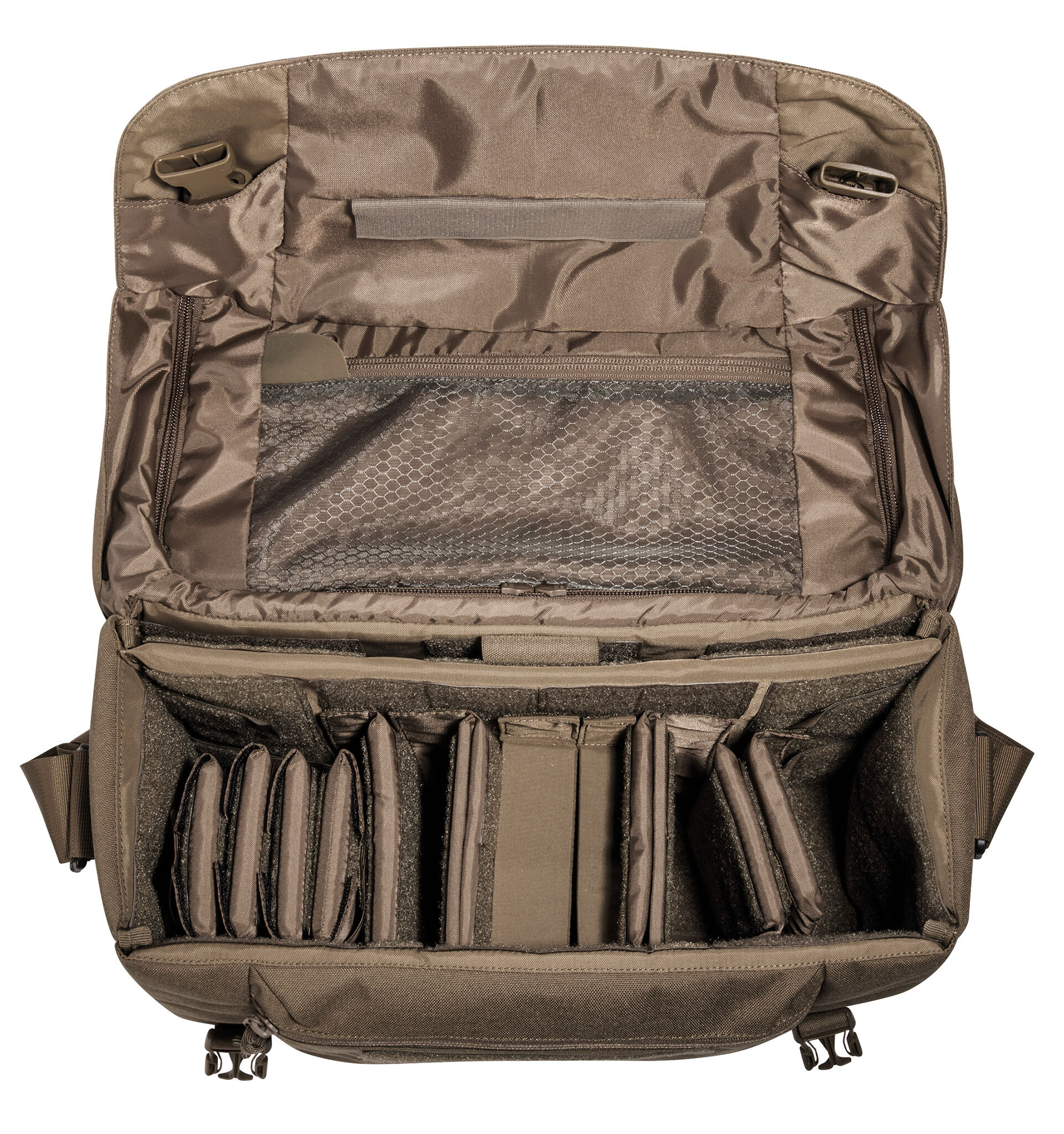 All around padded shoulder bag. The Tasmanian Tiger Modular Equipment Case is internally covered with a large MOLLE Velcro area and equipped with flexible-use padded dividers. The separate, width-adjustable laptop compartment can also be used as a weapons compartment. The flap is secured with Velcro and quick-release buckles. Extra zipper allows quick access from the top.