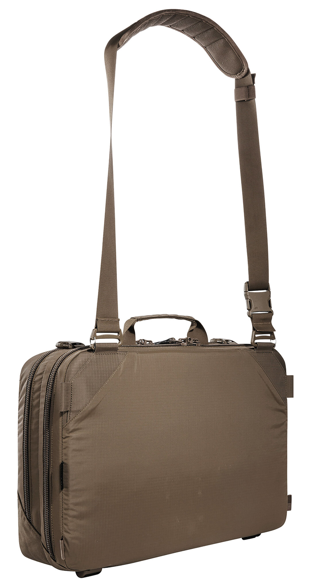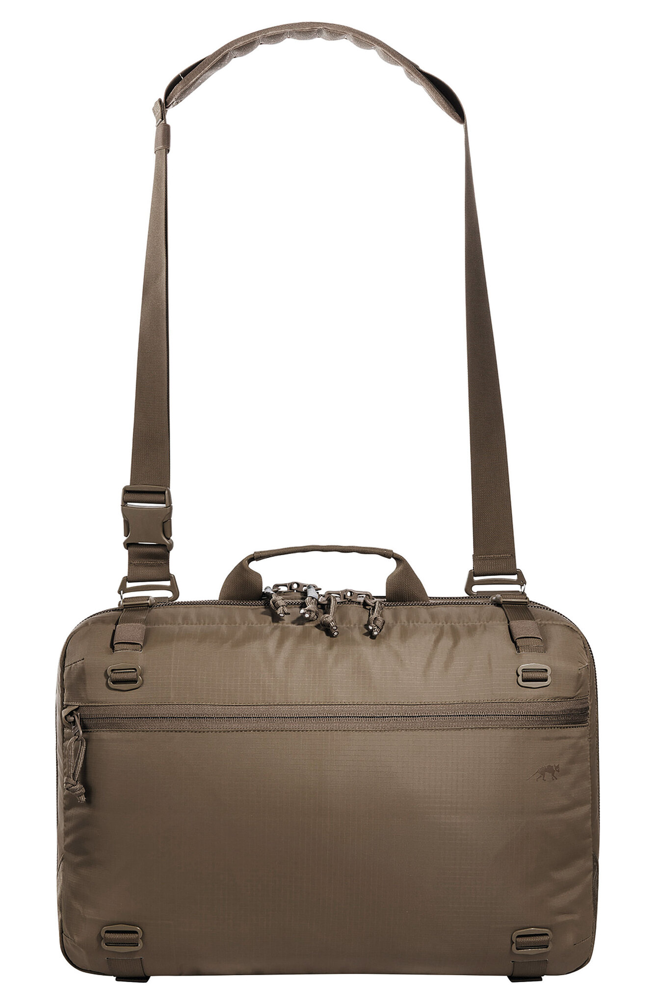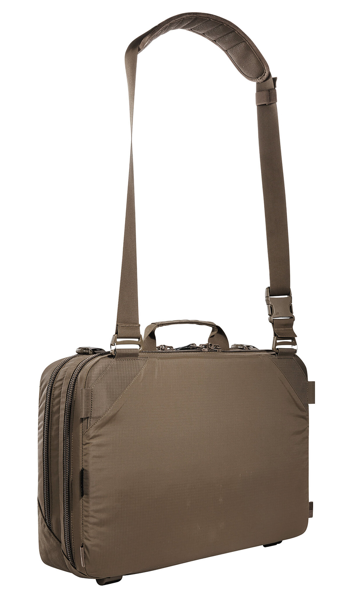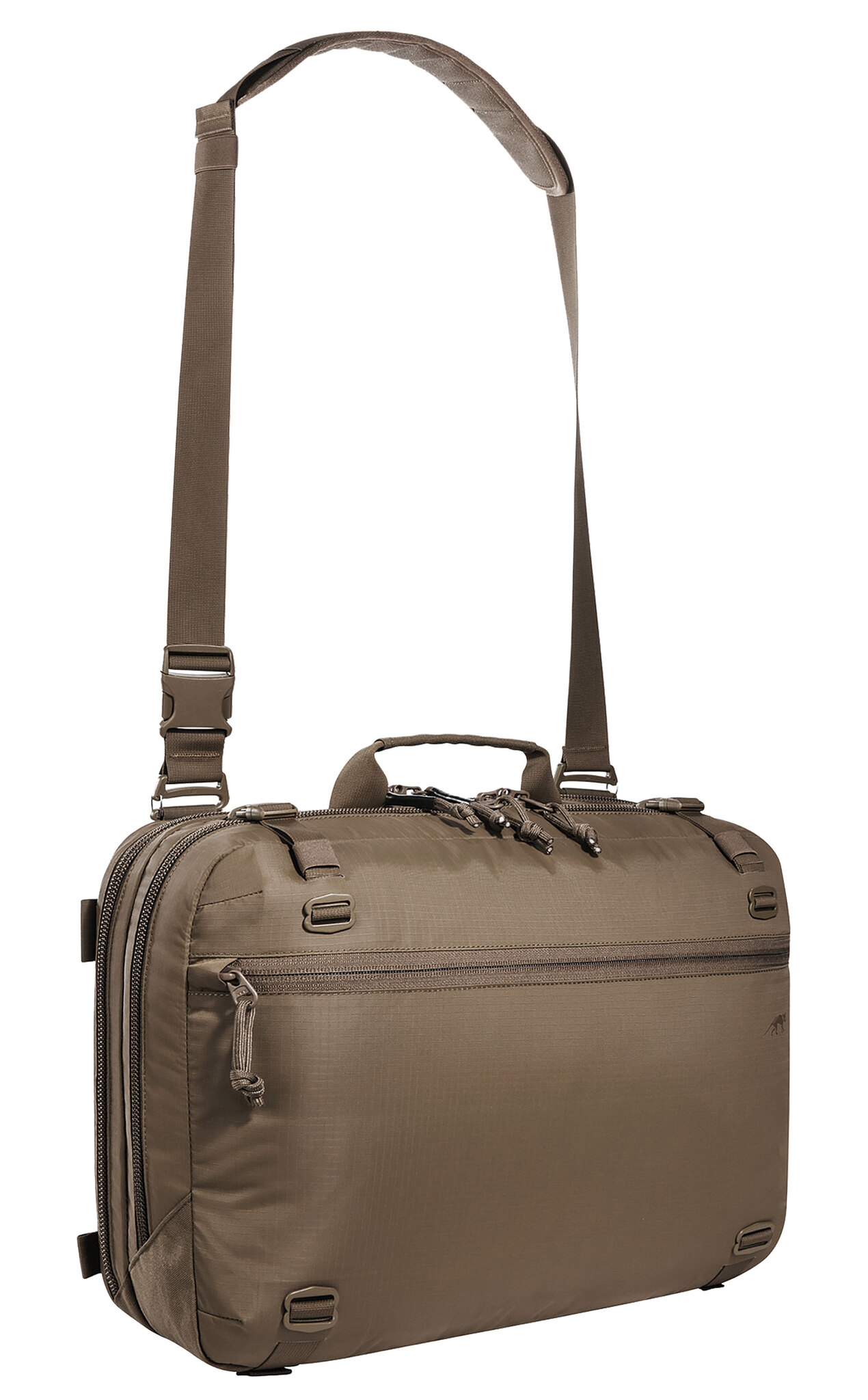 Compressible shoulder bag with two lockable zippered main compartments. The TT Shoulder Bag has two compartments, one of them padded, and a flat zippered front pocket. Both main compartments have Lasercut MOLLE Velcro areas on one side and pure Velcro areas on the other side for individual equipment. Using the buckles on the outside, the bag can be compressed, removable shoulder strap and waist strap with individual pick-up points.