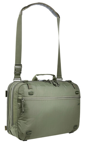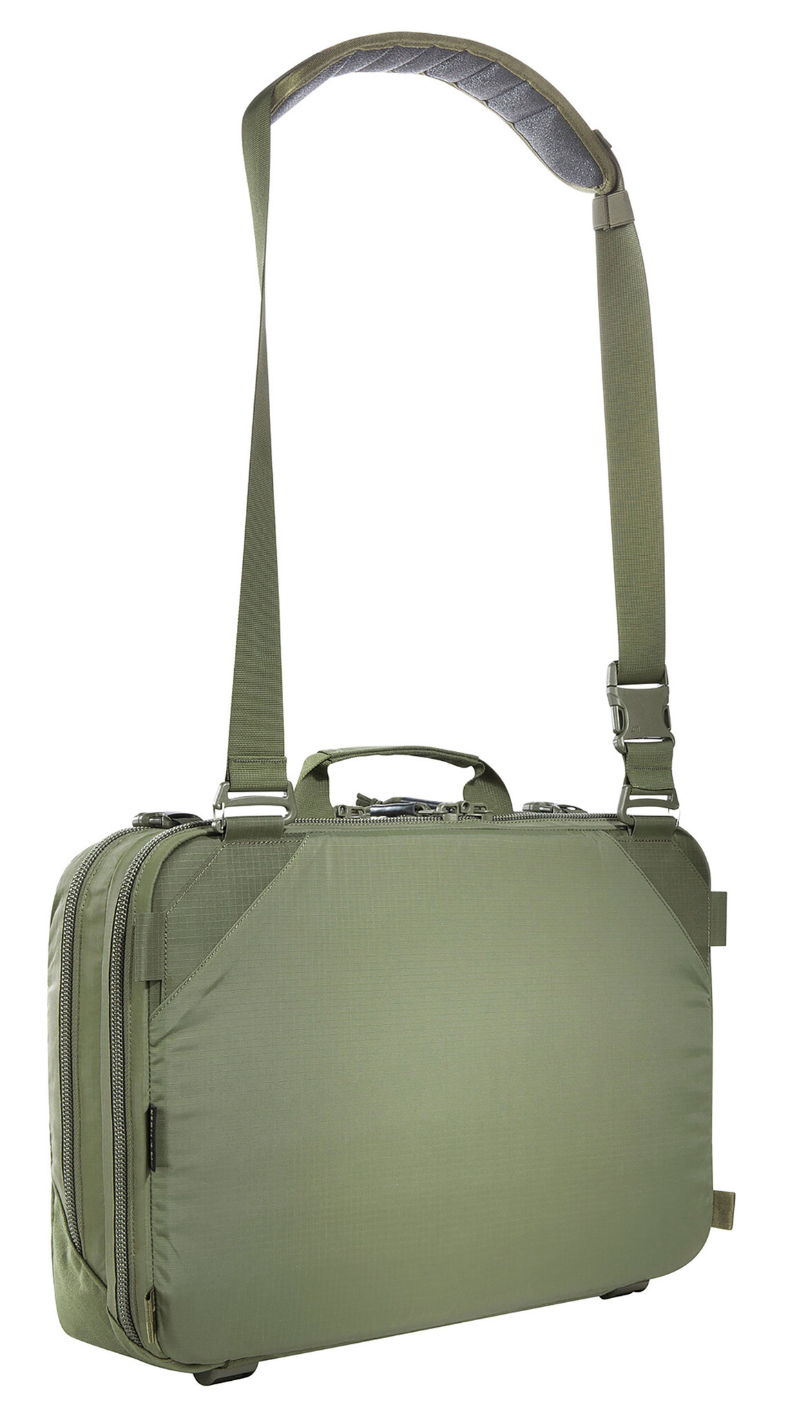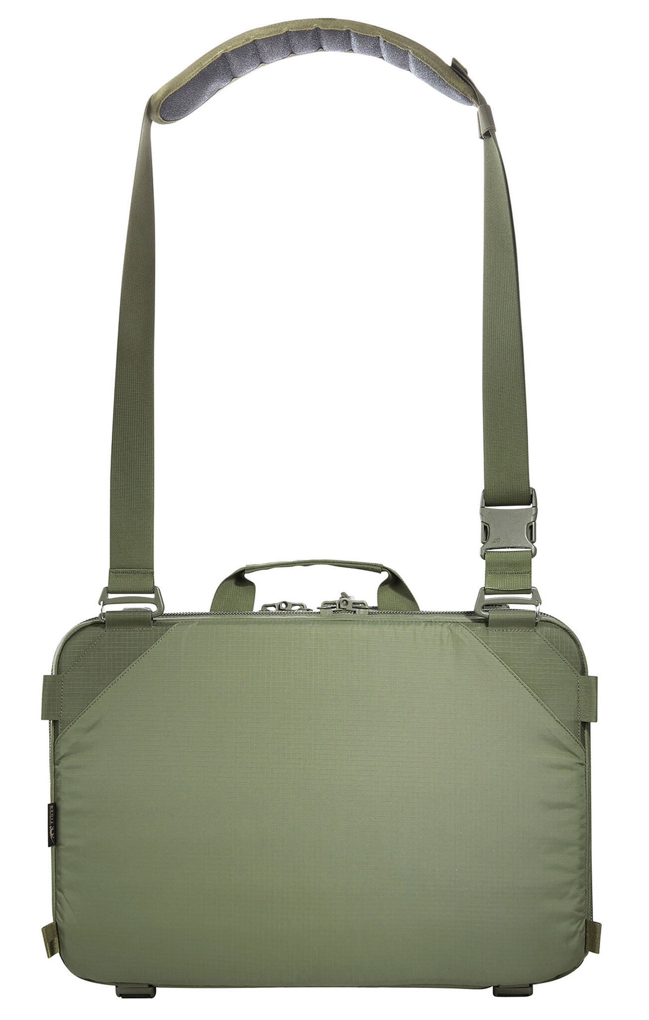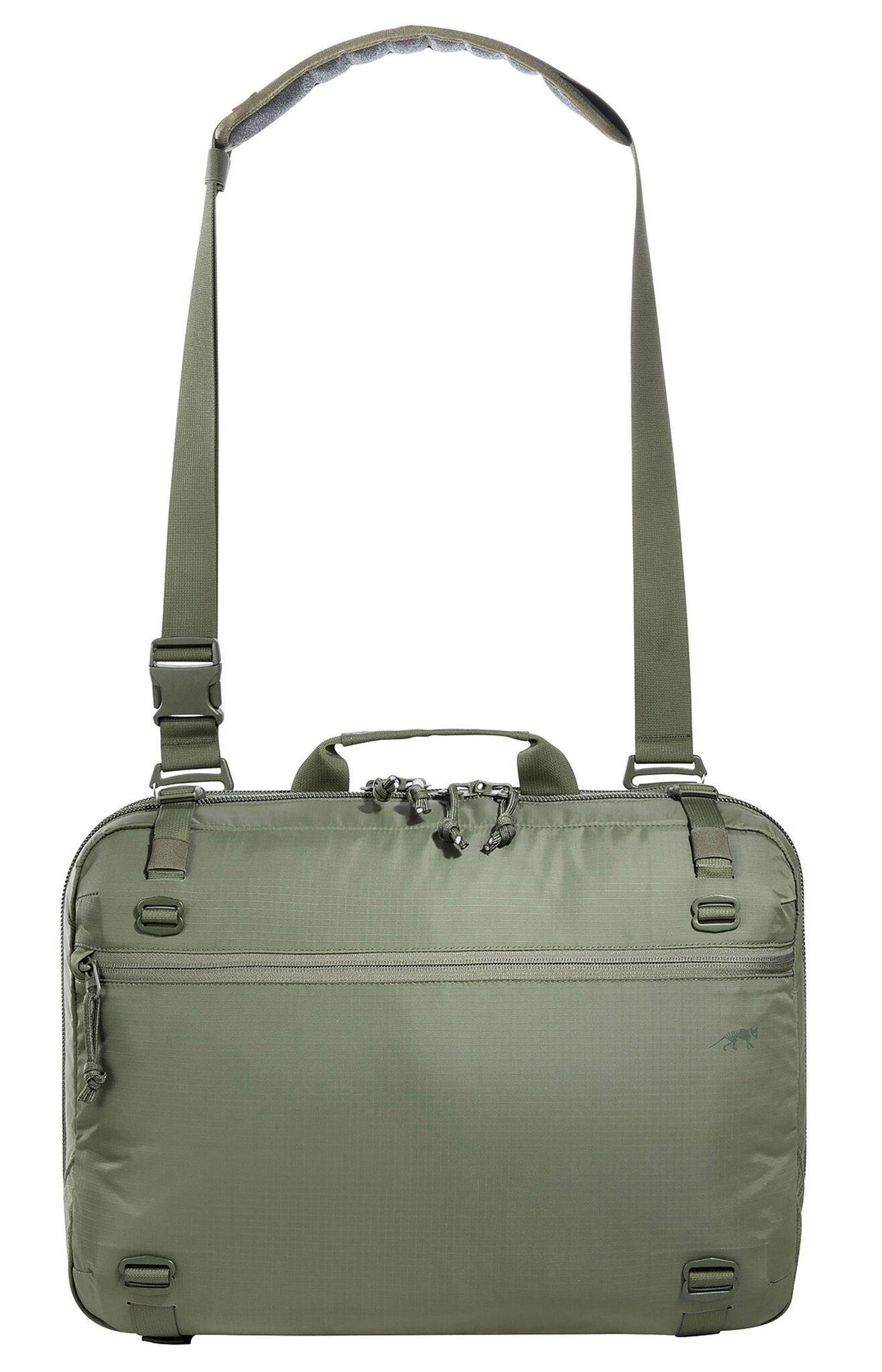 Compressible shoulder bag with two lockable zippered main compartments. The TT Shoulder Bag has two compartments, one of them padded, and a flat zippered front pocket. Both main compartments have Lasercut MOLLE Velcro areas on one side and pure Velcro areas on the other side for individual equipment. Using the buckles on the outside, the bag can be compressed, removable shoulder strap and waist strap with individual pick-up points.