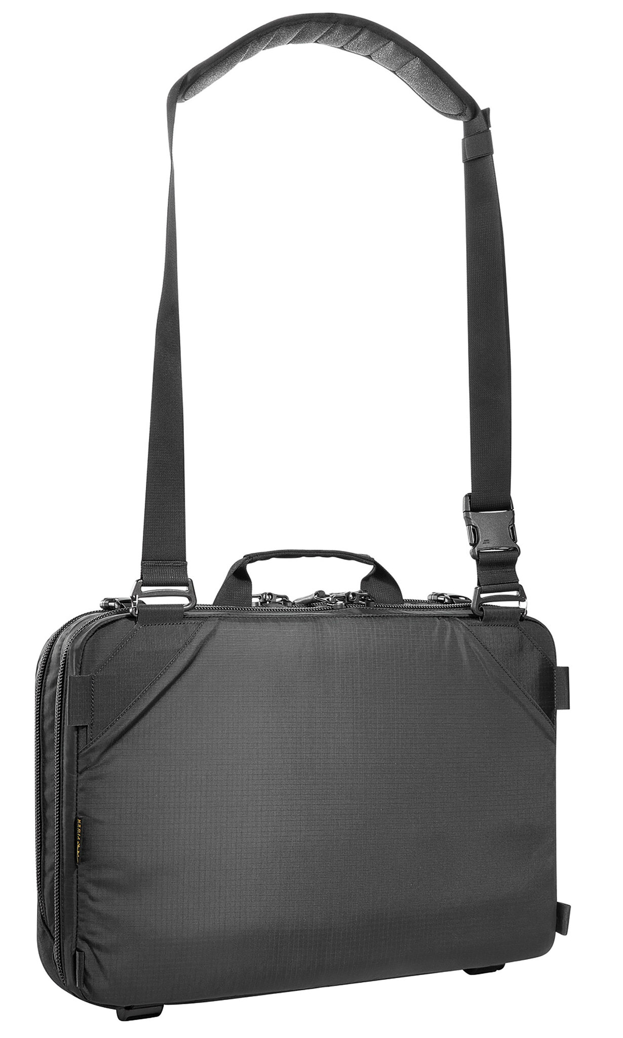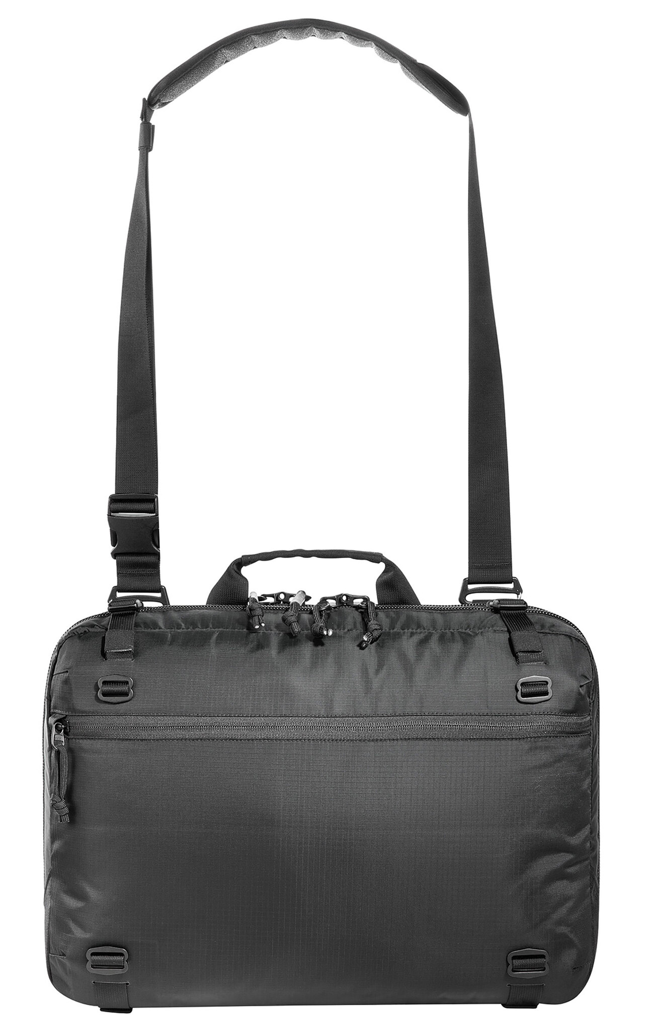 Compressible shoulder bag with two lockable zippered main compartments. The TT Shoulder Bag has two compartments, one of them padded, and a flat zippered front pocket. Both main compartments have Lasercut MOLLE Velcro areas on one side and pure Velcro areas on the other side for individual equipment. Using the buckles on the outside, the bag can be compressed, removable shoulder strap and waist strap with individual pick-up points.
