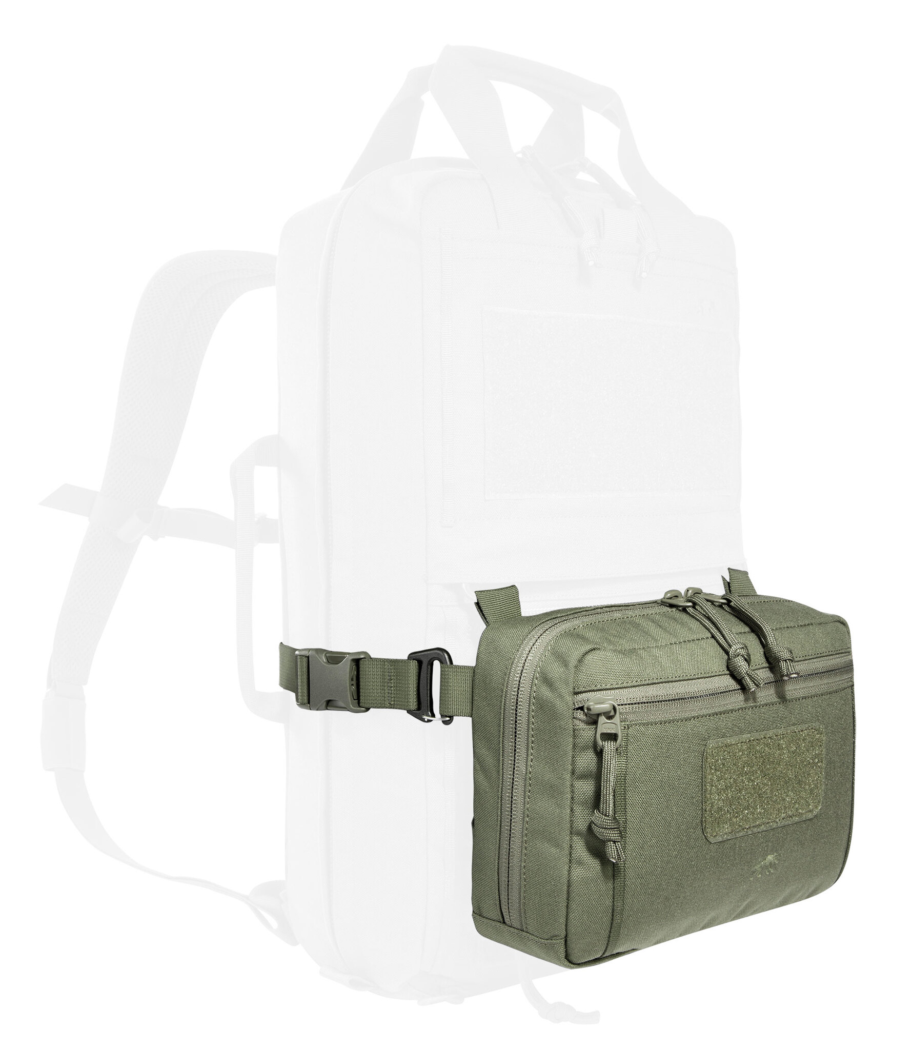 The Tasmanian Tiger Tac Pouch 8.1 Hip features a removable MOLLE reverse system for attachment to plate carriers and backpacks. The pouch can be used in combination with the Tasmanian Tiger HarnessSet, an adapter solution is available for this purpose and other MOLLE surfaces can be hooked up with appropriate buckles. There is also an opening for a 50 mm belt loop. On the front is a flat zip pocket and 2 daisy chain with a length of 120 mm and 3 loops each, perfect for the included bungee cord. Inside the large zipper - main compartment is a zippered mesh pocket, elastic loops and a MOLLE Velcro area.