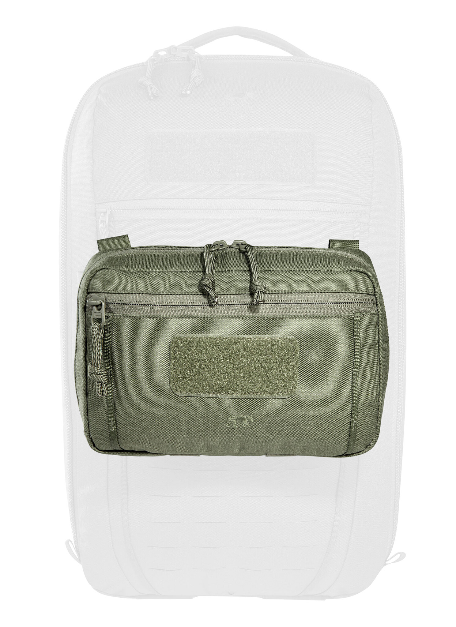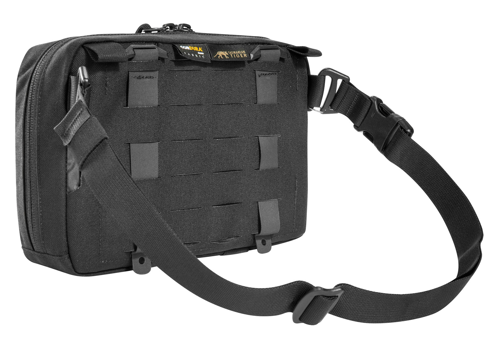 The Tasmanian Tiger Tac Pouch 8.1 Hip features a removable MOLLE reverse system for attachment to plate carriers and backpacks. The pouch can be used in combination with the Tasmanian Tiger HarnessSet, an adapter solution is available for this purpose and other MOLLE surfaces can be hooked up with appropriate buckles. There is also an opening for a 50 mm belt loop. On the front is a flat zip pocket and 2 daisy chain with a length of 120 mm and 3 loops each, perfect for the included bungee cord. Inside the large zipper - main compartment is a zippered mesh pocket, elastic loops and a MOLLE Velcro area.
