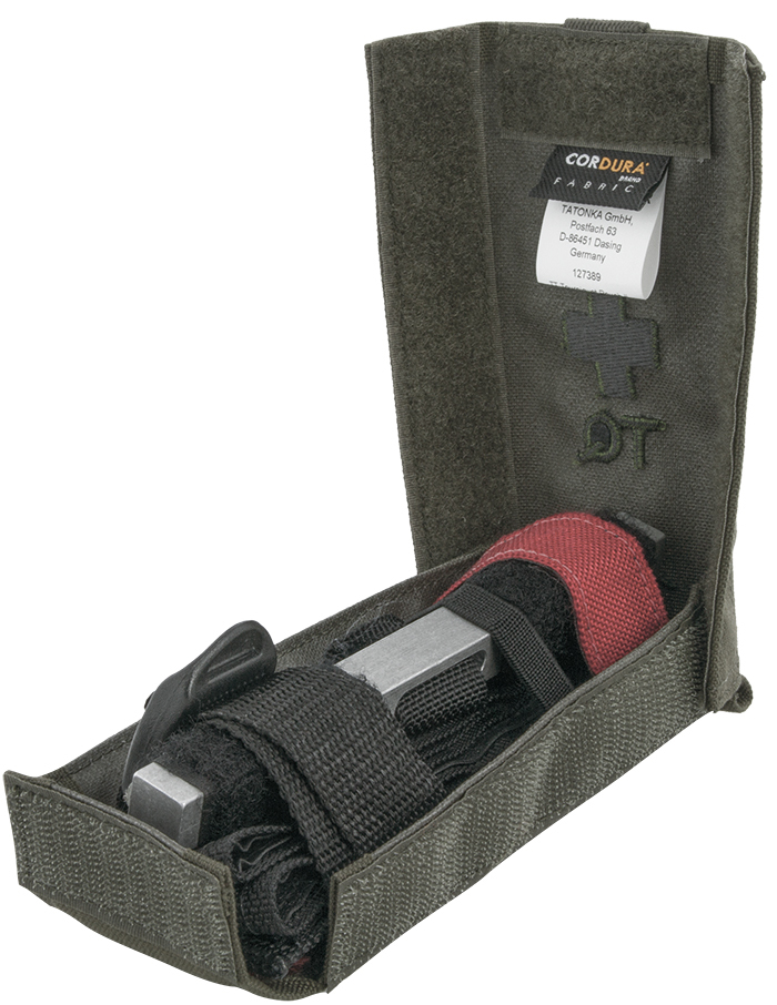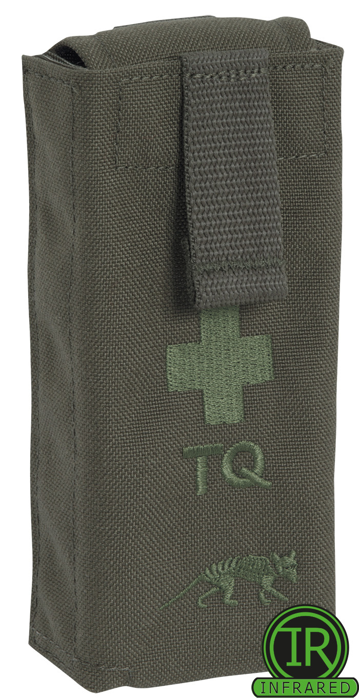 Tasmanian Tiger Tourniquet Pouch II in stone gray olive, fully equipped to TL8305-0278/I1 and TL8305-0281 IRR safe.