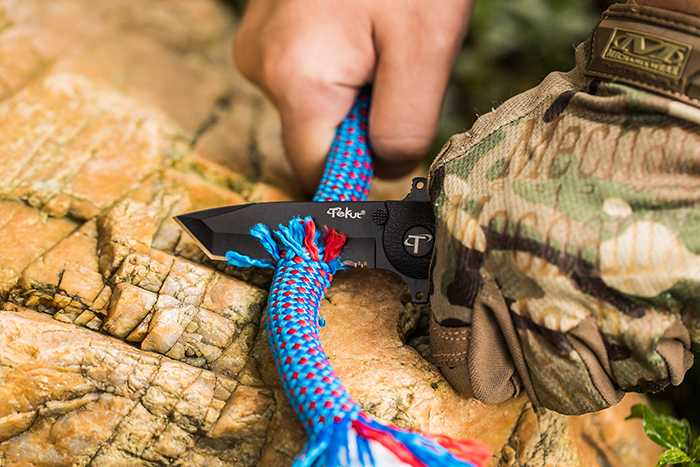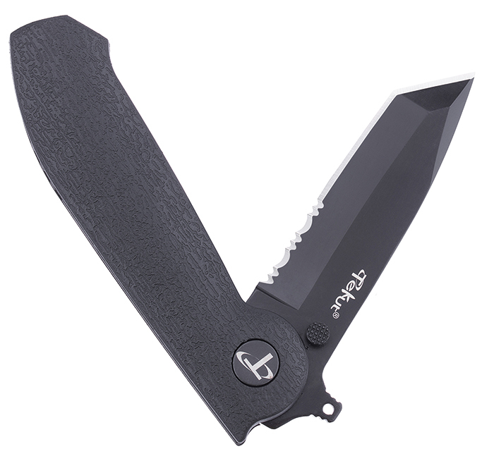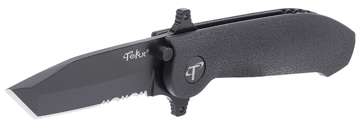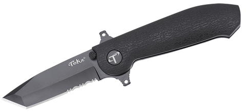 The Tekut ARES SON is a tactical mission knife with double-sided thumb stud, black coated Tanto blade with partial serrated edge.