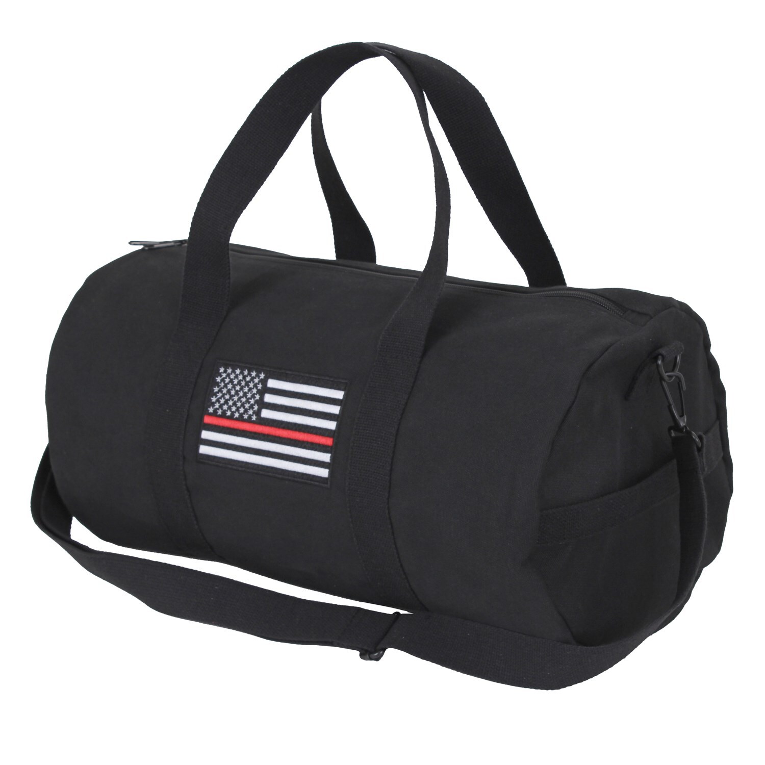Rothco's Thin Red Line Canvas Shoulder Duffle Bag is the perfect bag for traveling or the gym while supporting firefighters and the fire department. The 19" x 9" duffle bag is made of a heavyweight cotton canvas, with a detachable and adjustable shoulder strap as well as twin carry-on handles. On one side of the canvas shoulder back is an embroidered Thin Red Line US Flag. There is also a zippered pocket at the end of the bag.