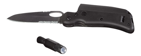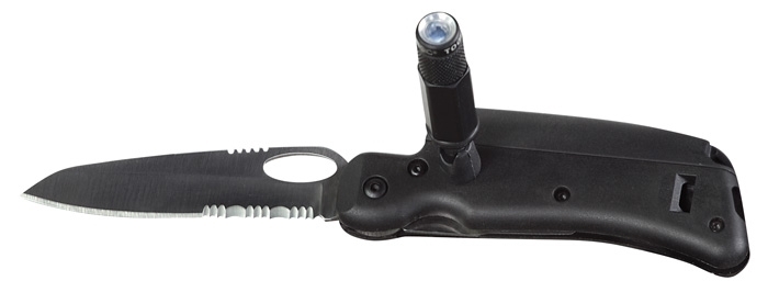 Tool Logic Survival Rescue Tool with flashlight, partial serrated edge and an overall length of 18.3 cm.