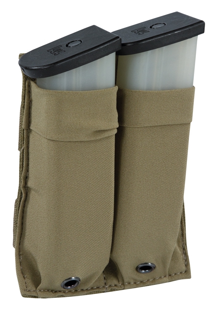 Lightweight, low-profile modular magazine pouch from Tasmanian Tiger made of elastic fabric to hold double-row pistol magazines (HK P8, Glock, SIG, Beretta M9).