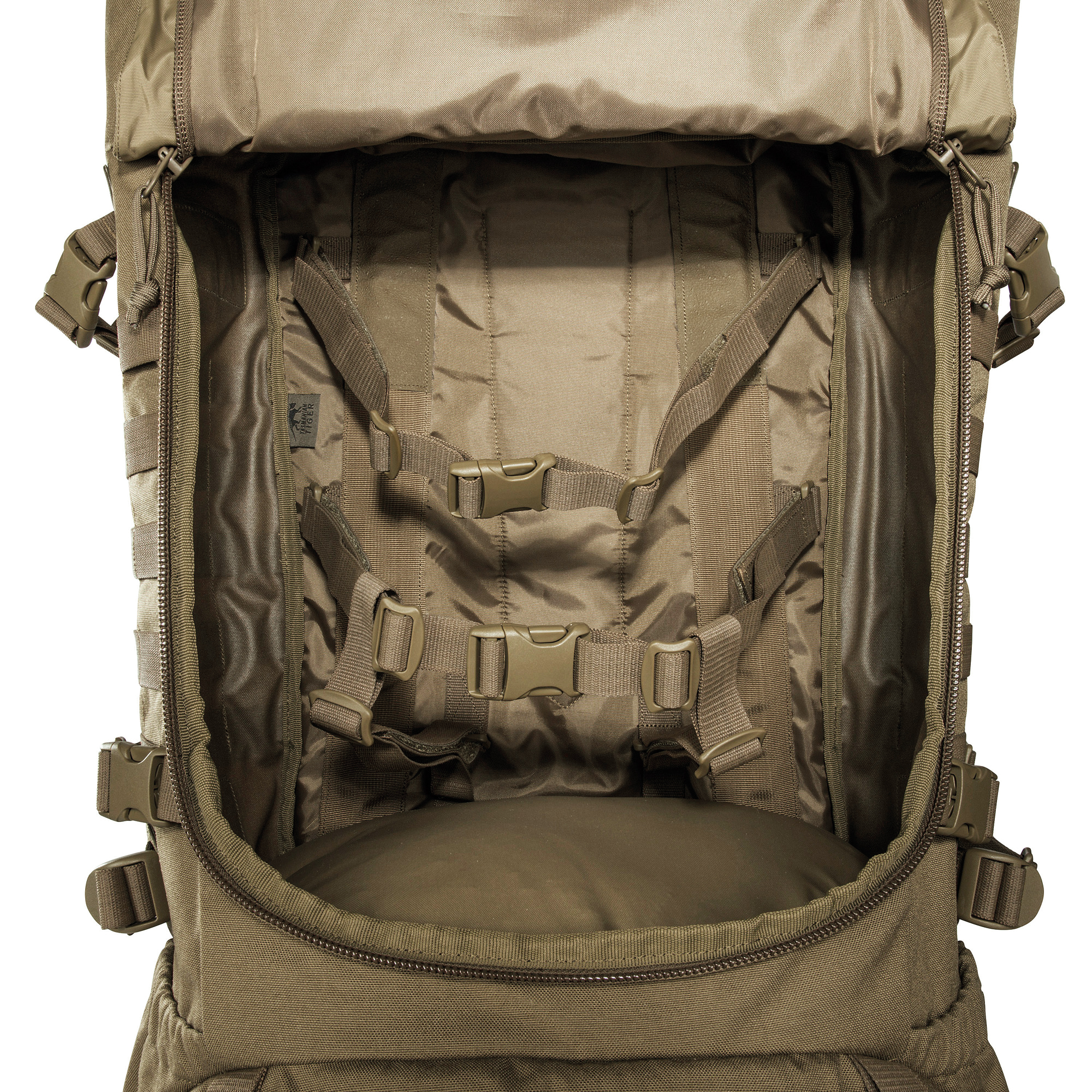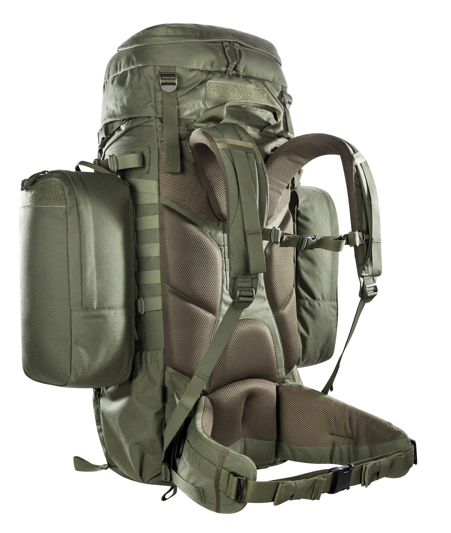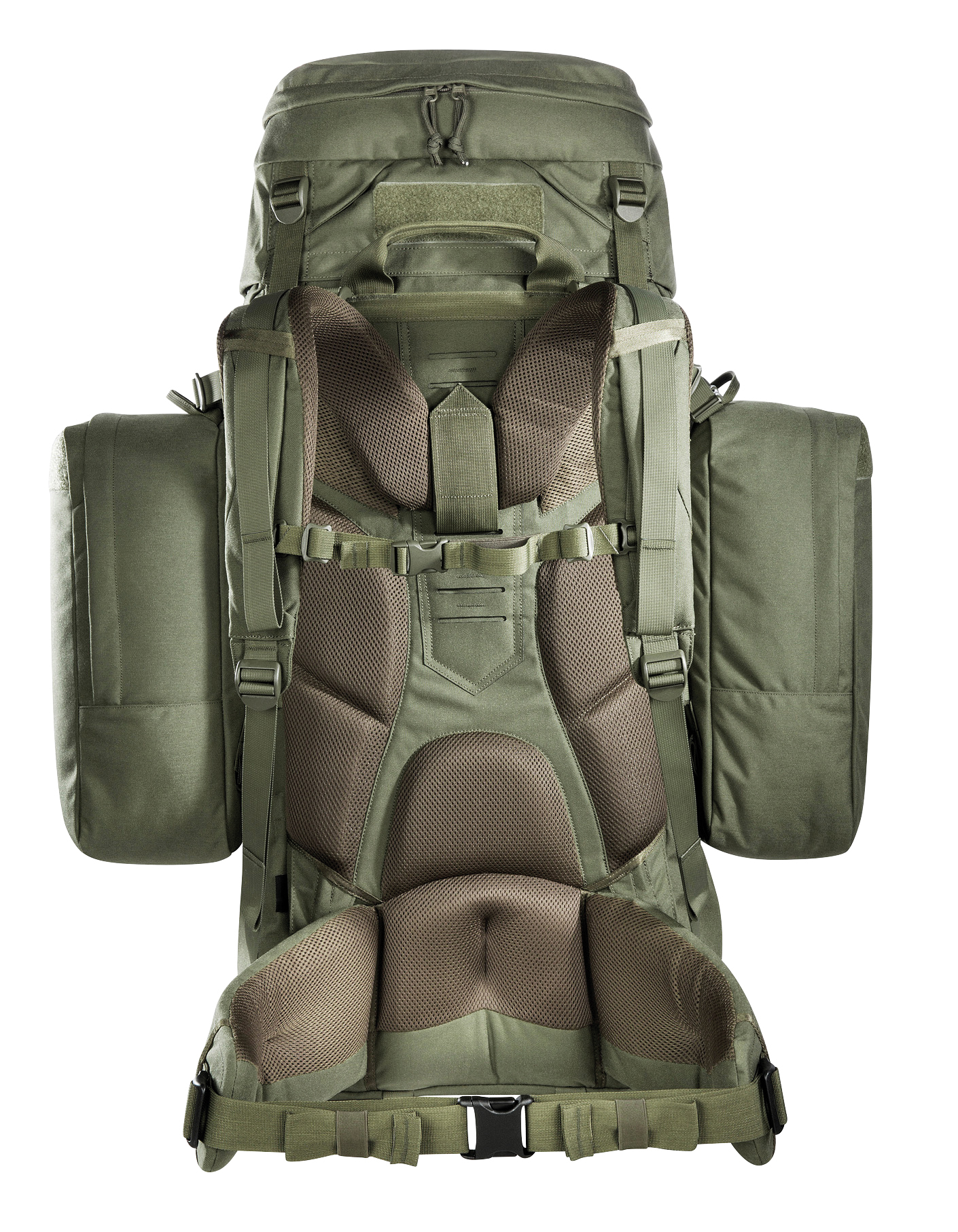 The TT Mil OPS Pack 80+24 is equipped with the proven and size-adjustable V2 carrying system. The V2 was developed for loads up to 25 kilograms. A combination of aluminum and GRP rods provides an excellent ratio of efficient load transfer and flexibility at the same time. The ergonomically designed hip belt with lumbar padding and three-dimensionally shaped hip wings is comfortably padded and prevents the backpack from slipping. The concave shaped back padding also ensures optimum support and good contact with the backpack - sufficient freedom of movement even when fully loaded. The load control straps, the comfortable shoulder straps and the lid height are adjustable and allow a precise fit adjustment