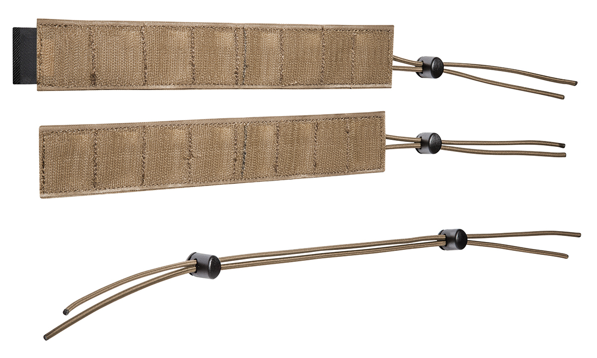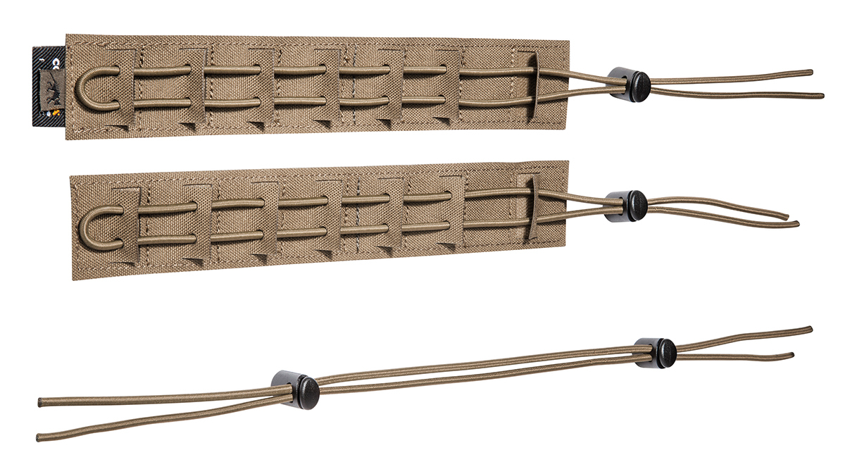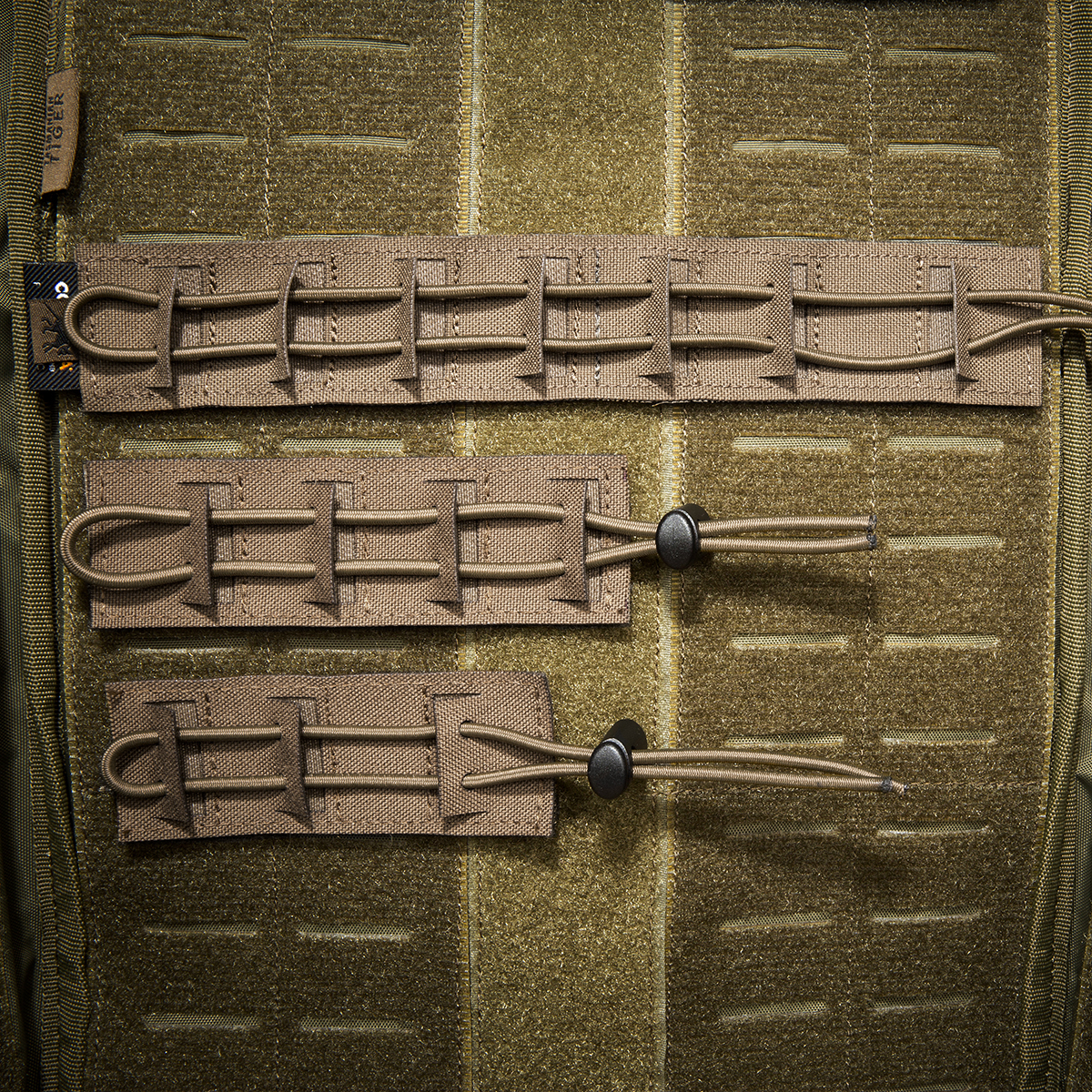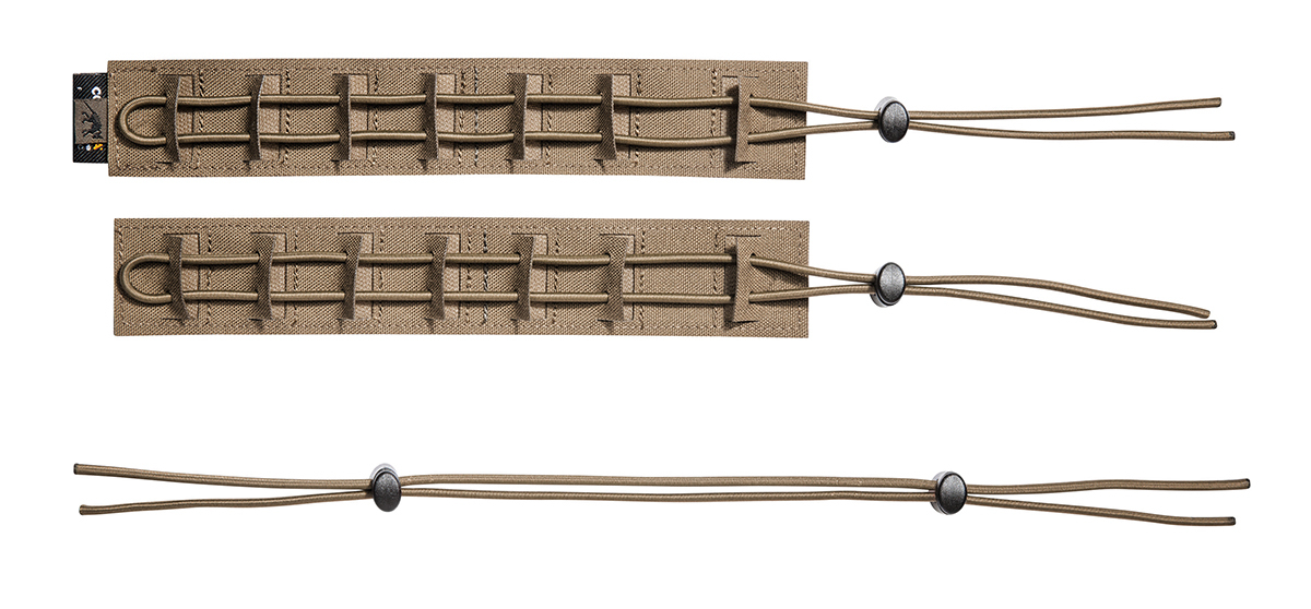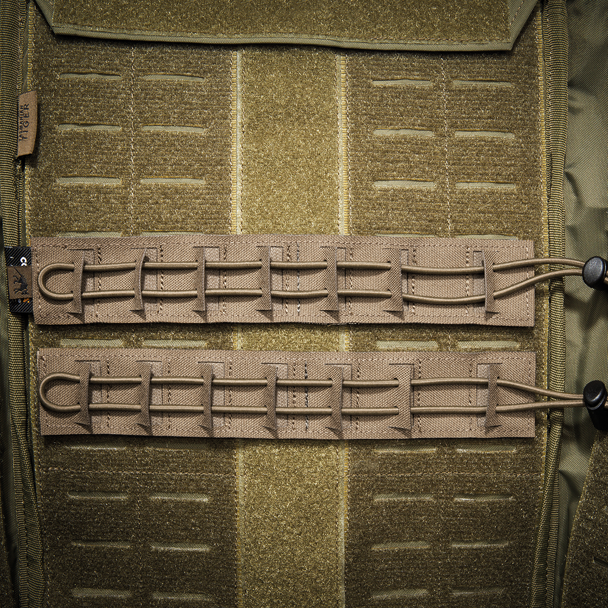 Flat bungee cord functional bar for e.g. small Medic parts with Velcro back. The strip can be flexibly velcroed into modular TT Medic Packs or attached to Velcro panels.