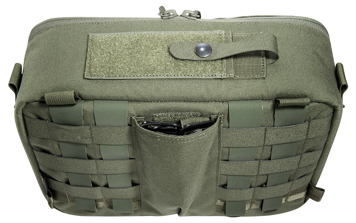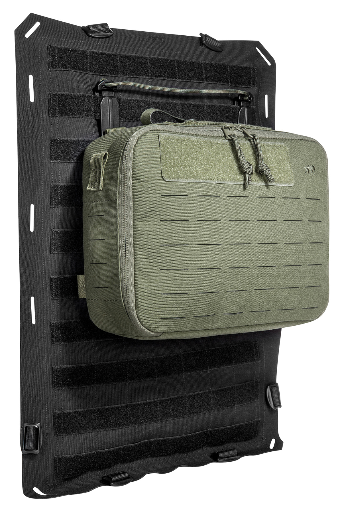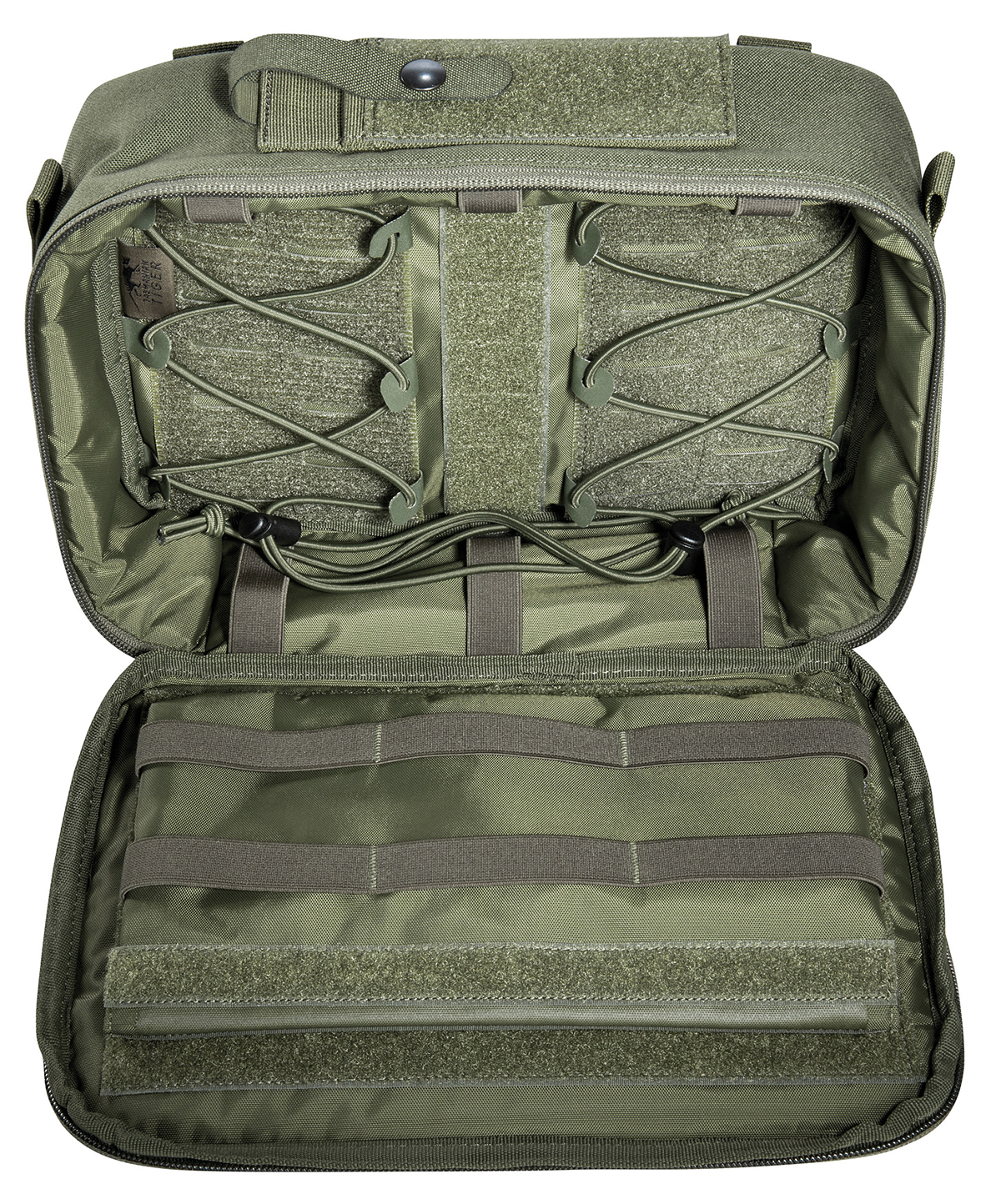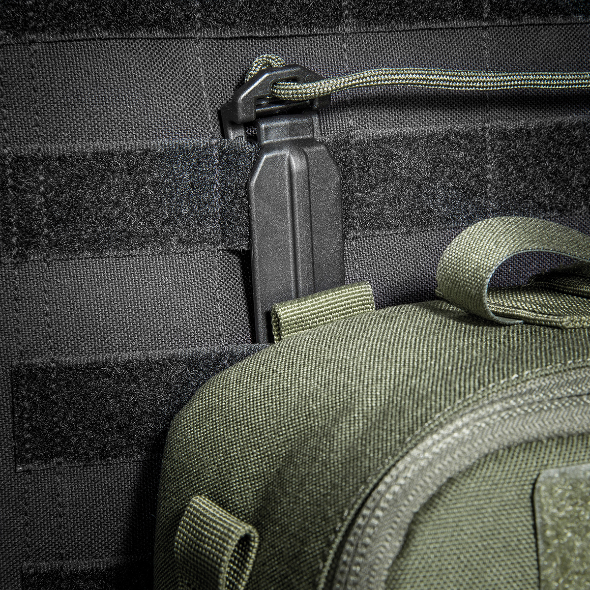 Padded Medic bag with various carrying options. The TT Modular Support Bag opens to the front and offers MOLLE velcro and bungee cord on the inside for individual equipment. There is laser cut MOLLE on the front and sides. The bag is equipped with a removable, stowable shoulder strap and also features MOLLE sticks on the back as a quick release system that allows it to be attached to plate carriers or backpacks. It can also be attached to the TT Modular Front Seat Panel (item 795927).