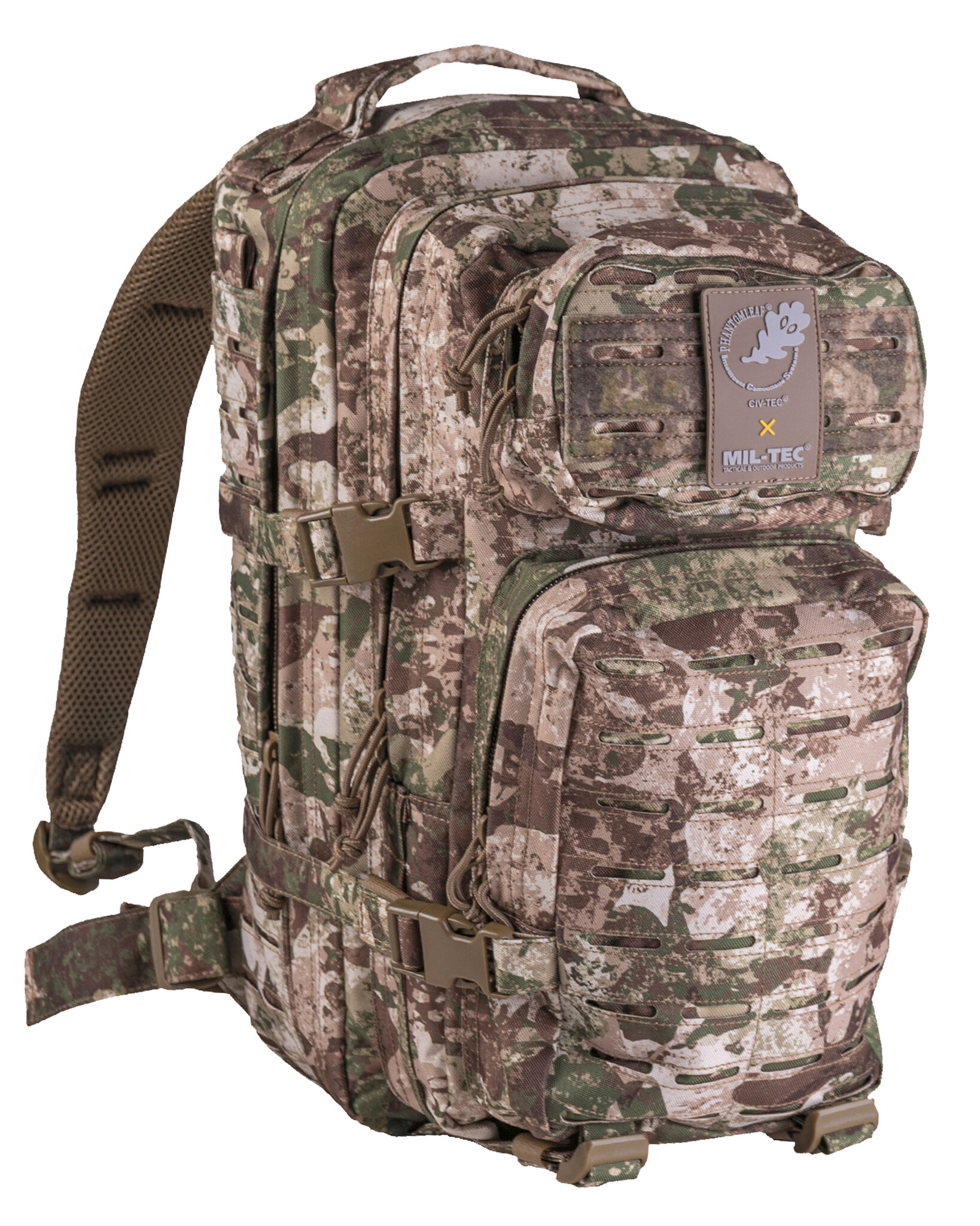 The Mil-Tec Assault Pack Jump is a robust 20 liter day backpack, which convinces with high wearing comfort and easy handling. Thanks to the modular design, it is individually customizable. Phantomleaf has developed three CIV-TEC WASP I camouflage colors exclusively for Mil-Tec.