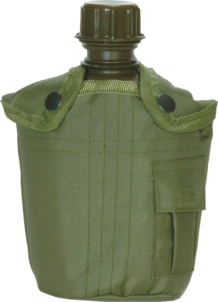 Replica of the classic US canteen with canteen cover. The canteen cover with snap closure has a small patch pocket with Velcro closure and ALICE fastening clips on the back.