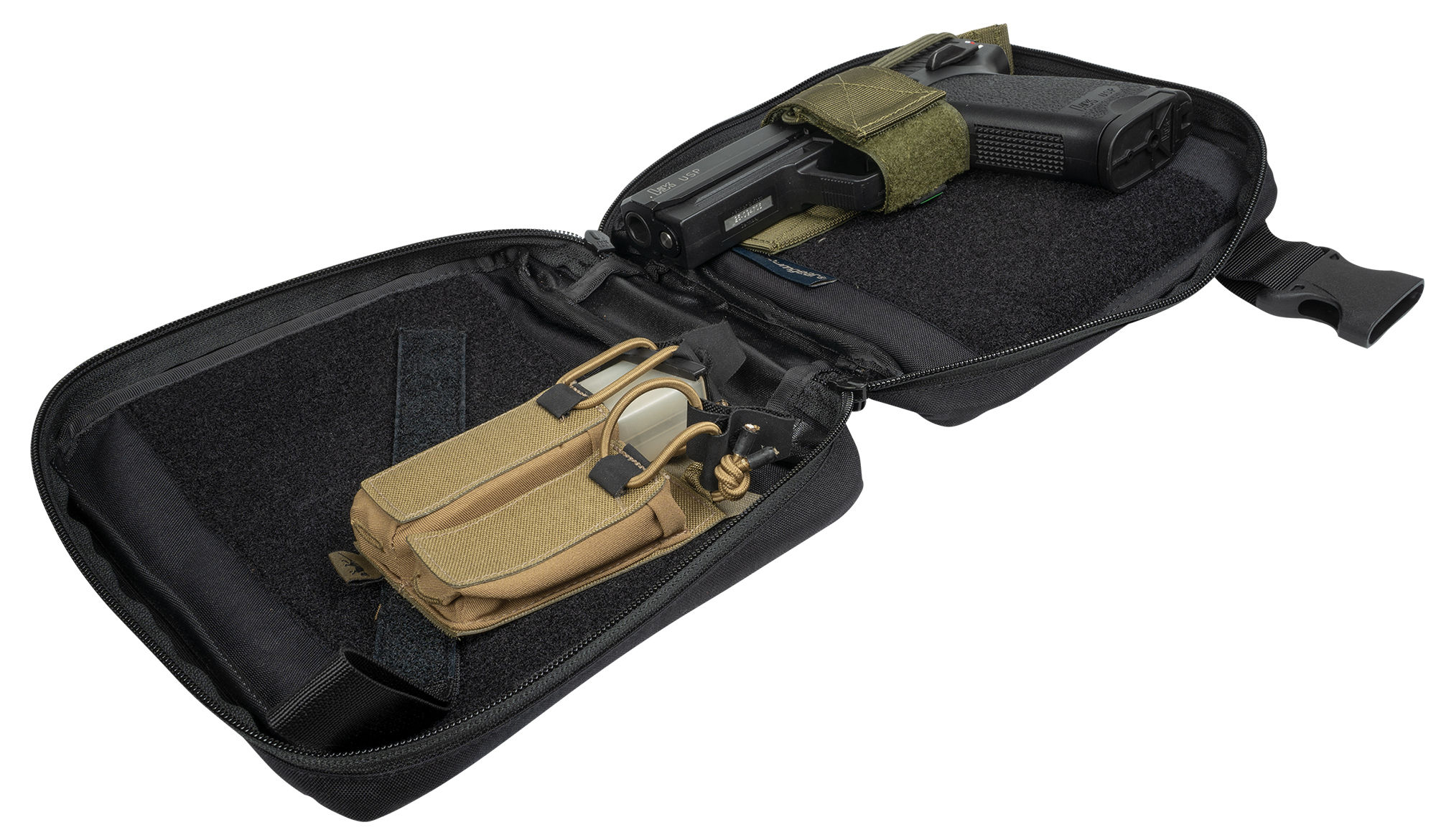 The unpadded carrying strap of the Ventumgear Concealed Carry (width: 40 mm) ensures unobtrusive carrying comfort - the bag can even be worn under a jacket. The strap is attached to the bag with two clips so that it can be released quickly in an emergency. The outer material of the Ventumgear is made of robust 500D Cordura and is equipped with high-quality YKK zippers. On the front of the Ventumgear Concealed Carry Compadre Gen. 2 there is a Velcro surface to which an optionally available "cover panel" can be attached to make the bag look like an ordinary civilian bag (see article no.: 808369).