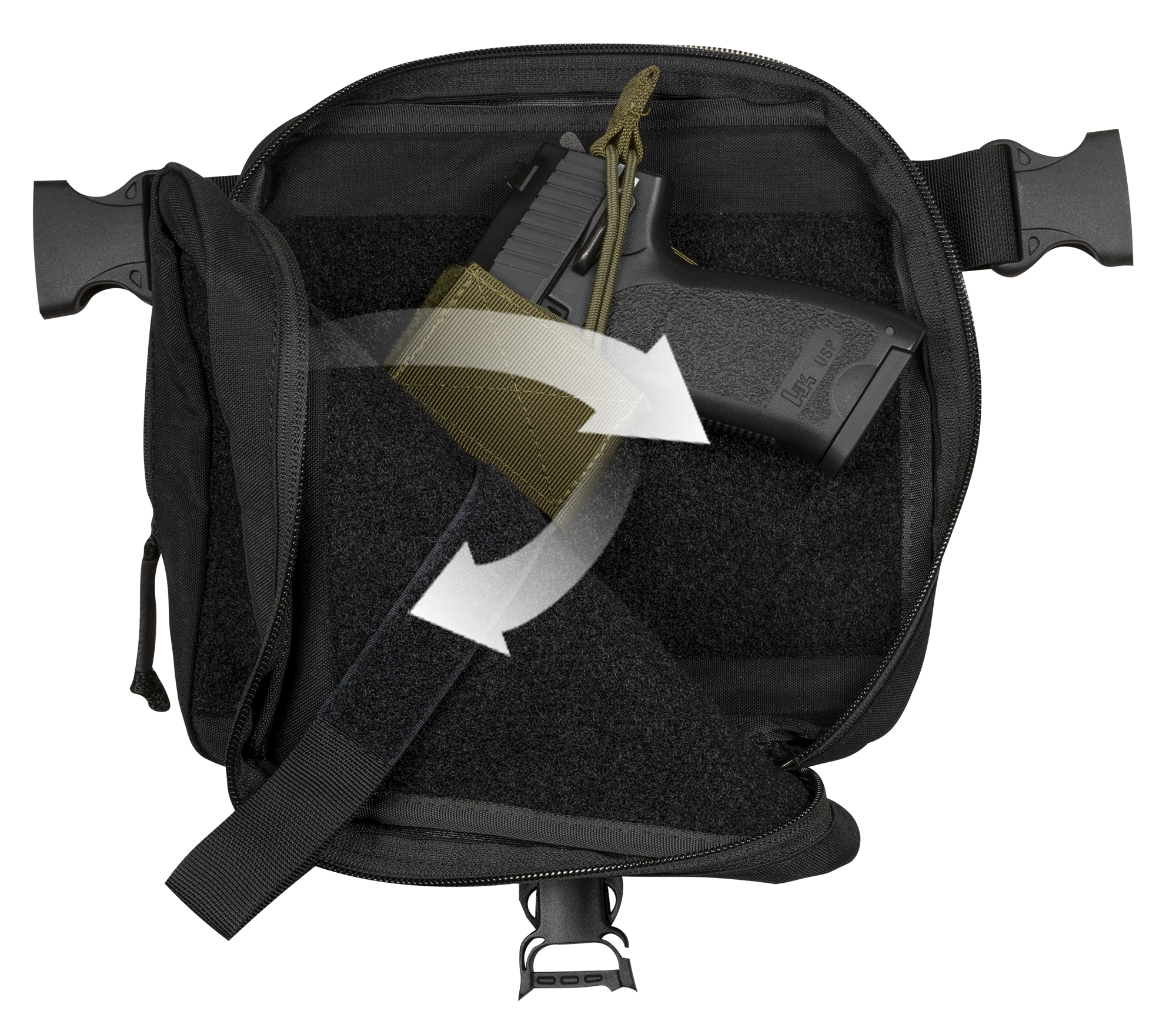 Although the Ventumgear Concealed Carry looks inconspicuous on the outside, it conceals a tactical modular design on the inside: The main compartment has an approx. 21 cm x 15 cm fleece Velcro surface on both the body and outer side to attach Velcro holsters or other equipment. The pouch allows quick access to the handgun through an opening flap that can be pulled down if necessary.