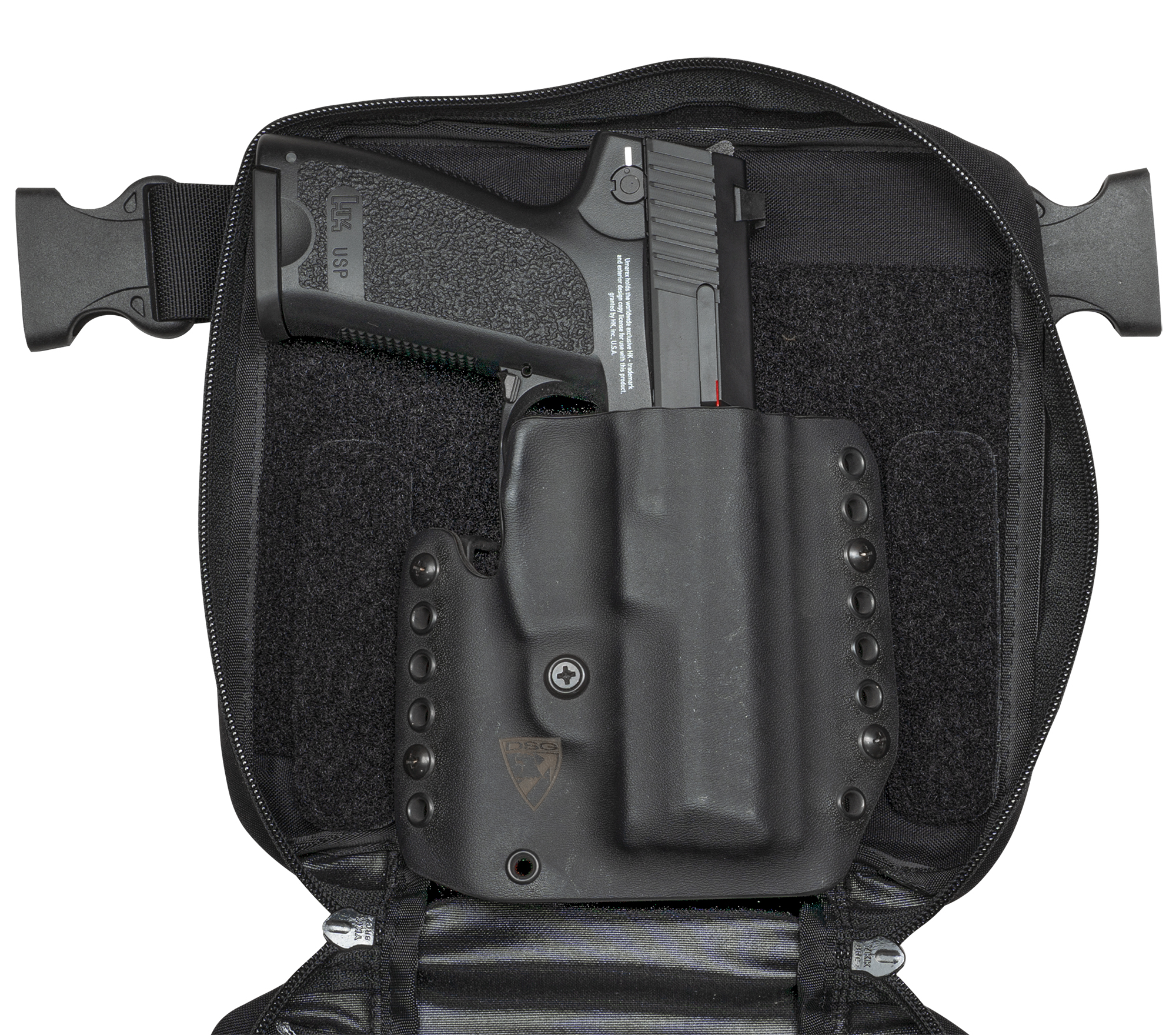 Each Ventumgear Concealed Carry includes a "Gripper" adapter that allows various belt holsters to be attached to the pouch, so that service holsters can also be used in the inconspicuous pouch.